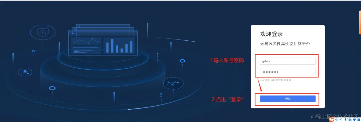 在天翼云官网开通弹性高性能计算服务后,官网控制台【集群详情页】会给出portal登录链接、portal用户名和初始密码,引导用户登录集群内portal。用户点击链接进入portal登录页面,输入账号和初始密码即可登录。