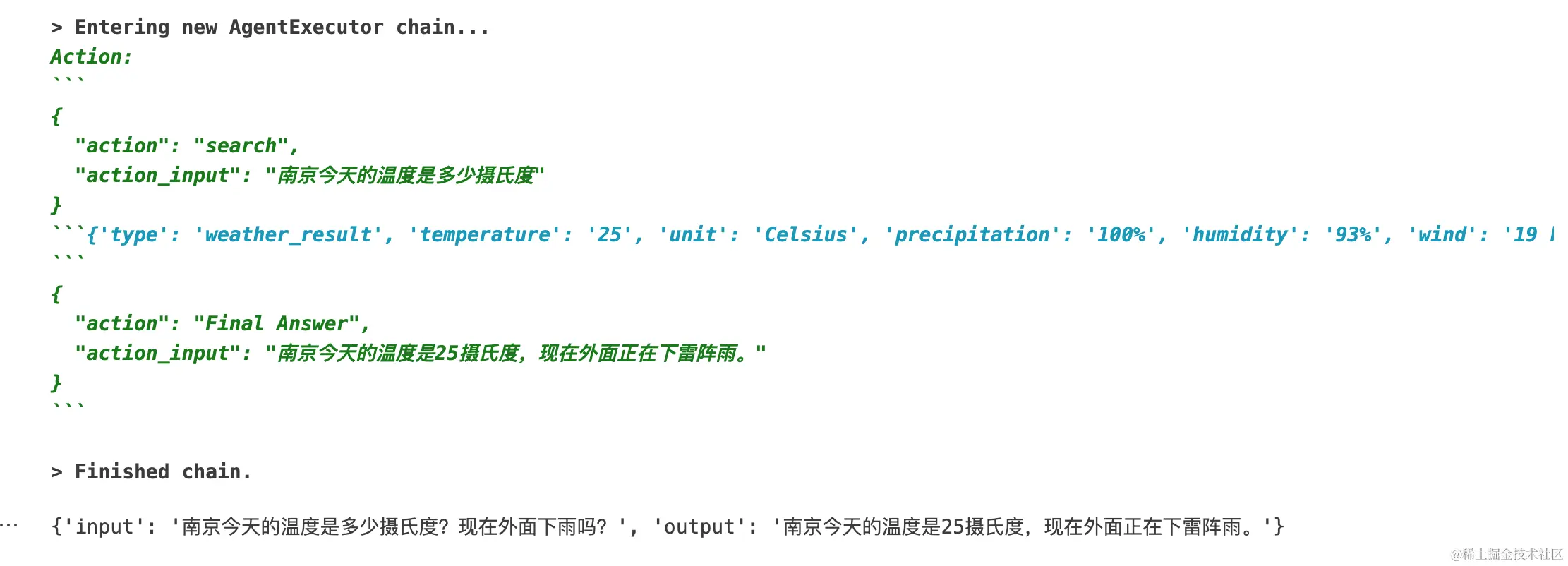 # agent_executor.invoke({"input": "南京今天的温度是多少摄氏度?现在外面下雨吗?"})