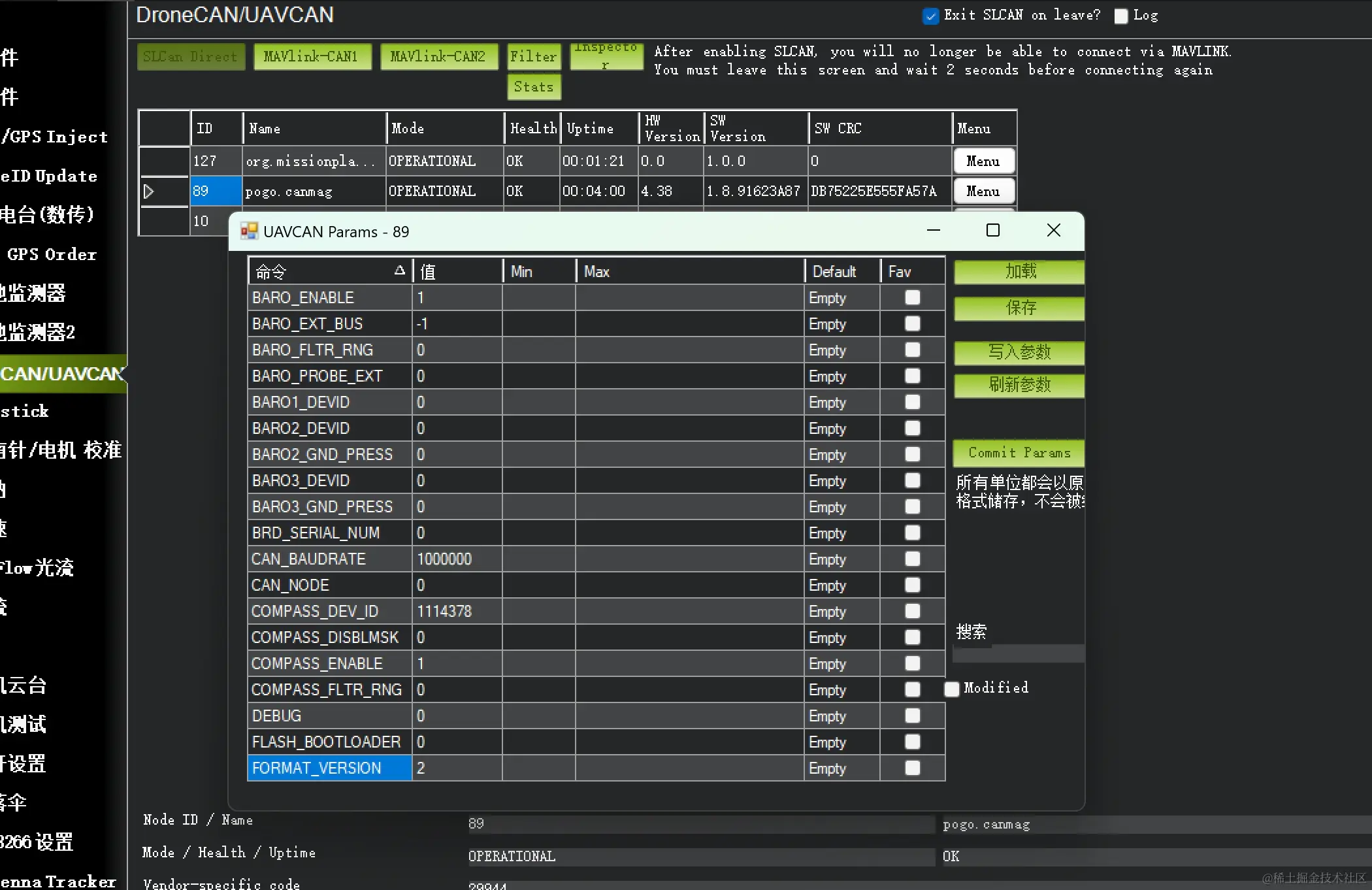 在初始设置 -> 可选硬件 -> DroneCAN/UAVCAN 界面点击 MAVlink-CAN1,MP会加载目前连接到飞控的DroneCAN节点。如果你的飞控开启了Slcan Direct 支持,那么你也可以点击 Slcan Direct 来加载DroneCAN节点,但一般情况下,除非有特殊需求,否则我们比较少开启 Slcan Direct 支持。