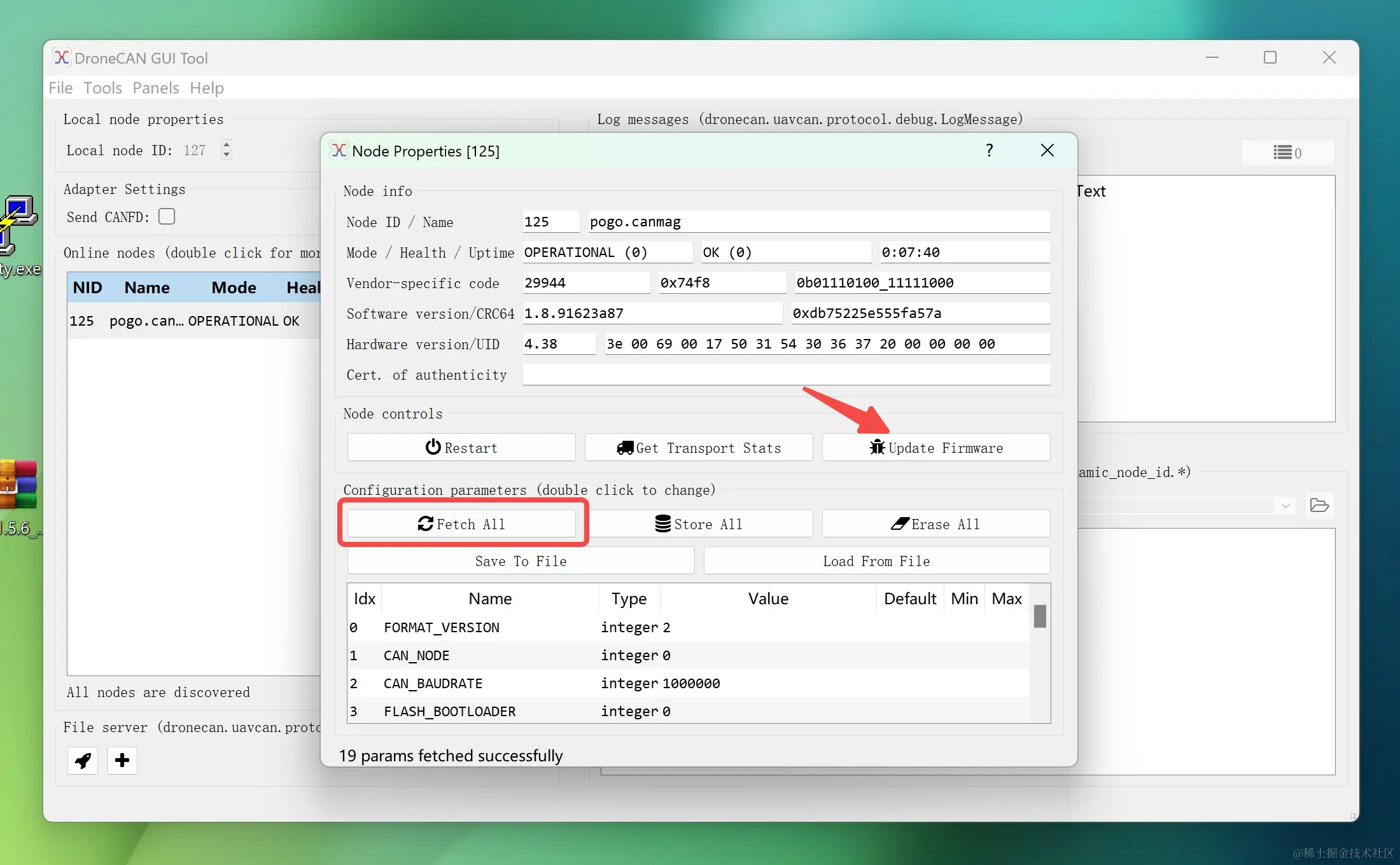 双击该Pogo-DroneCAN磁力计节点,DroneCAN_GUI_Tool会为该节点打开一个Node属性页面,你可以在该页面点击FetchAll查看和修改DroneCAN磁力计的所有参数,也可以点击Update Firmware更新该磁力计的固件。Pogo智能科技的该款DroneCAN磁力计目前不需要修改任何参数。