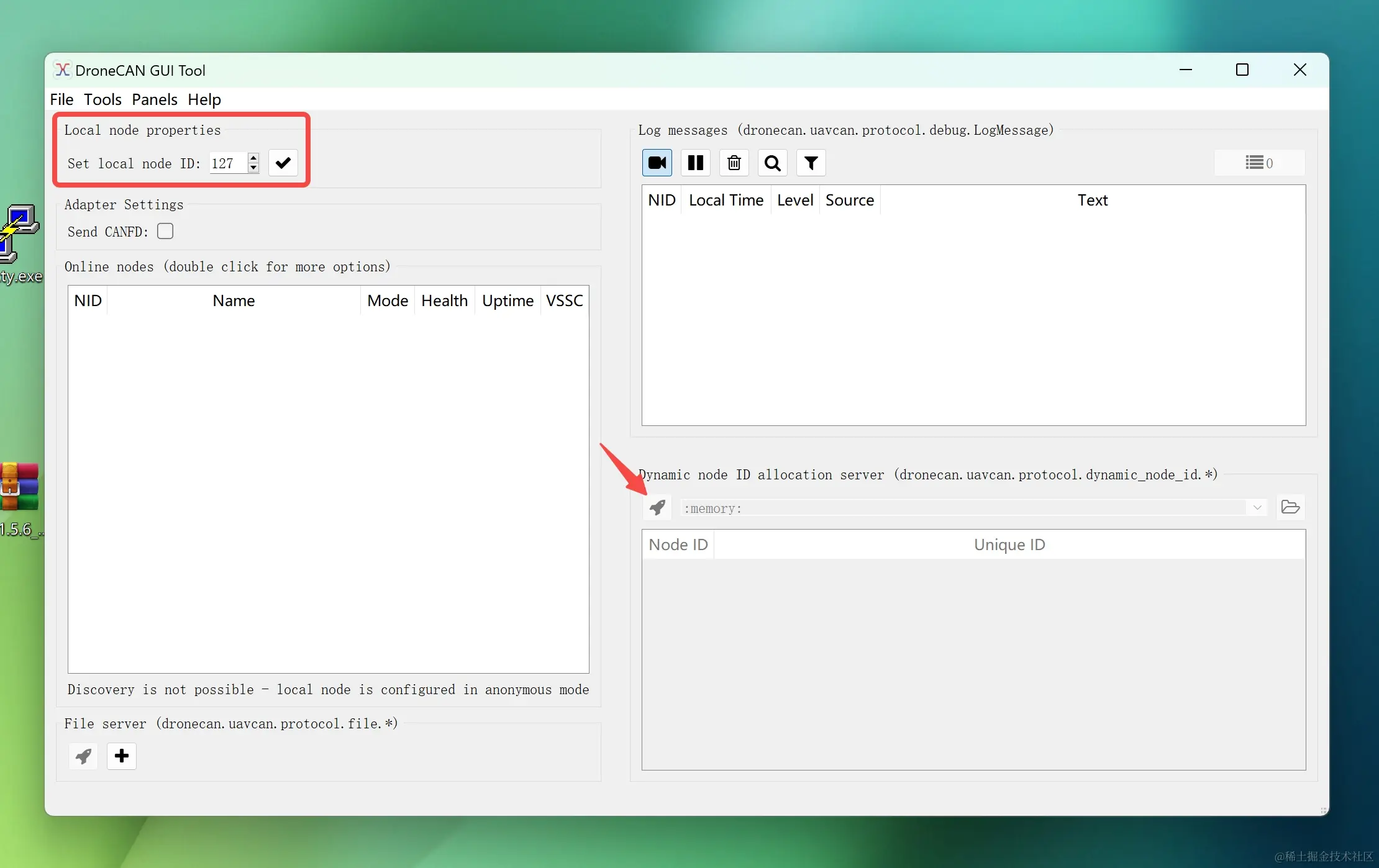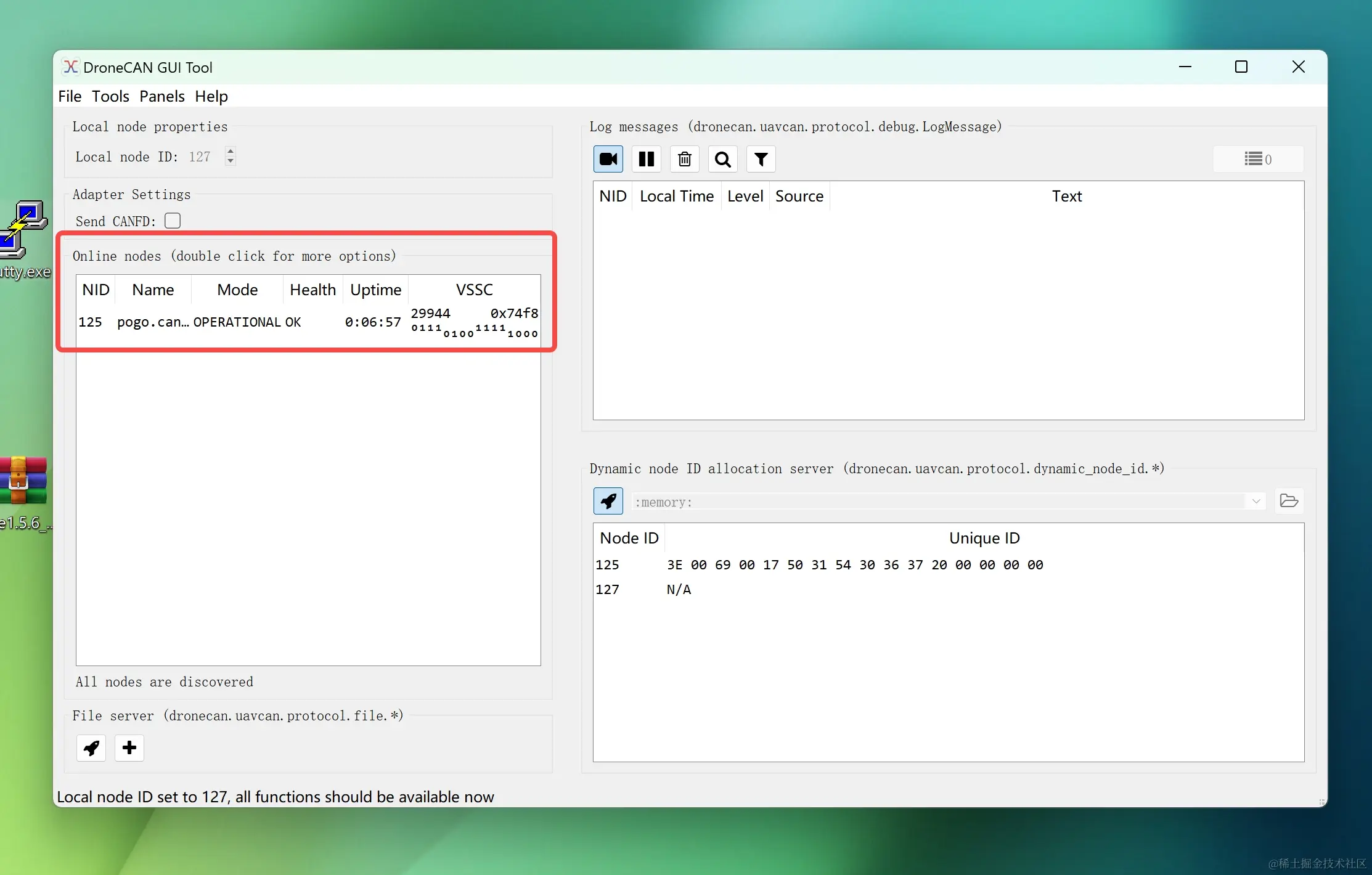 在电脑上打开DroneCAN_GUI_Tool上位机,选择 STM...Virtual COM Port,进入上位机后,依次在左上角设置local NodeID,在右下角点击小火箭icon(该操作的作用是给连接到DroneCAN调试器的DroneCAN外设自动分配NodeID),可以看到识别出了Pogo-DroneCAN磁力计。