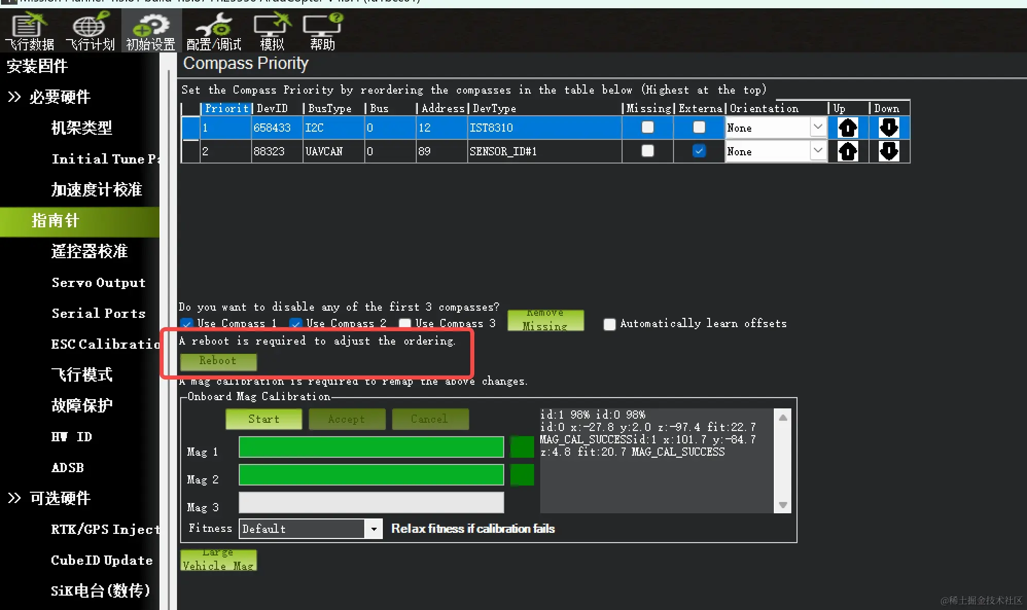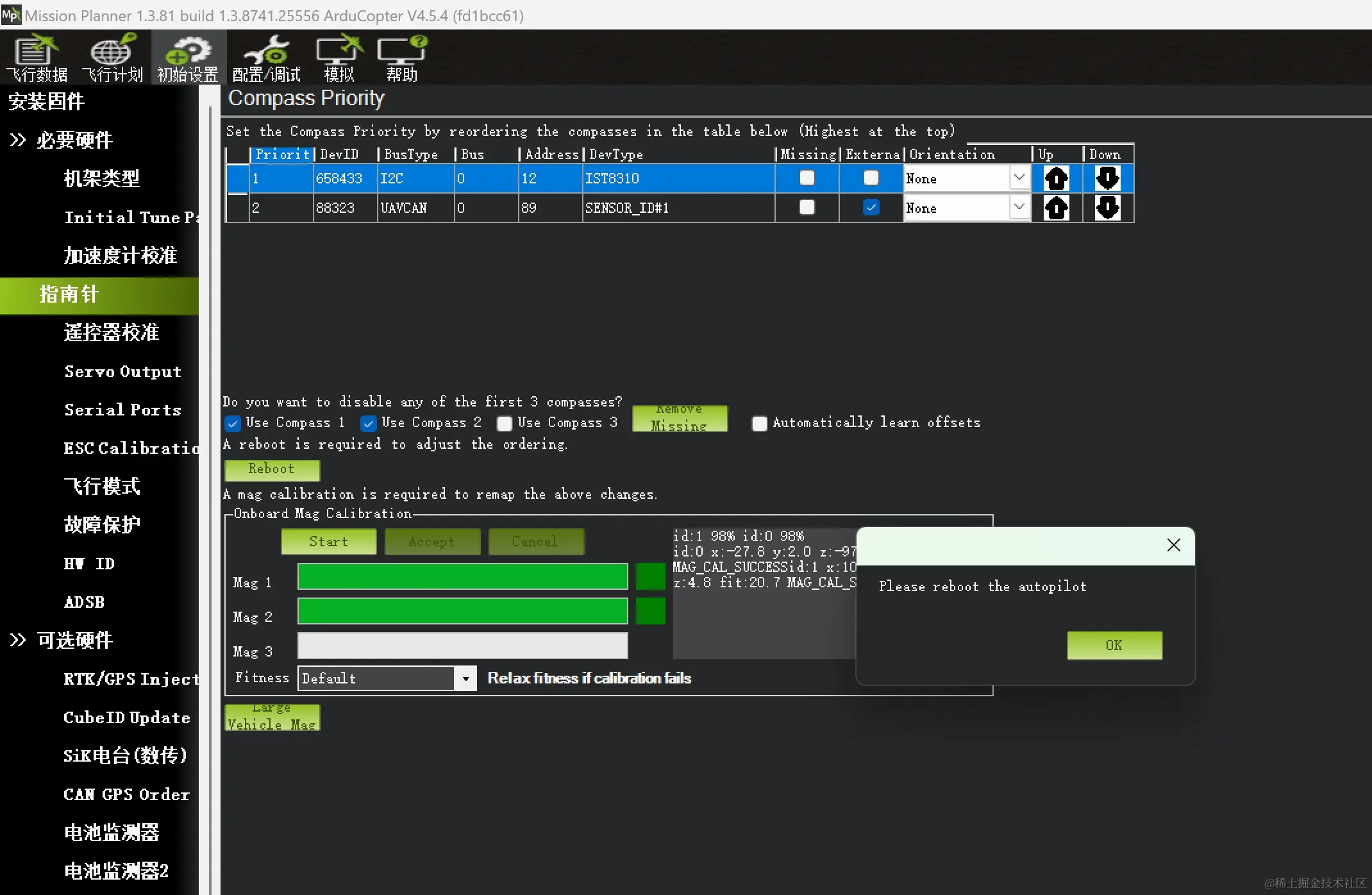 校准方式是,将外置磁力计和飞控朝向一致的固定连接在一起,并绕x、y、z 轴充分旋转飞控;不停地旋转飞控,直到校准进度条走满,MP提示重启飞控,点击ok,然后点击reboot,然后飞控重新上电,并重新将飞控与MissionPlanner连接。