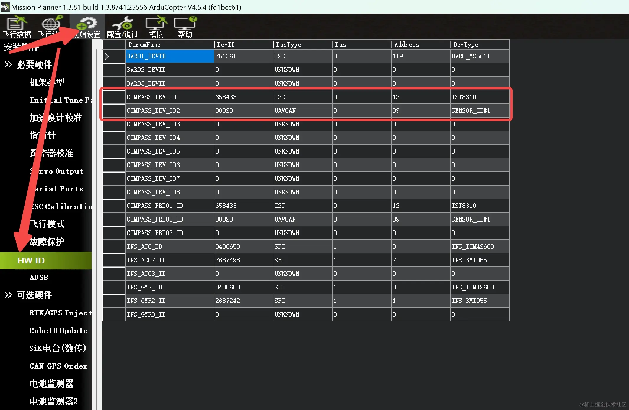 连接好后,切换到初始设置 -> 必选硬件 -> HW ID,在这里同样可以看到飞控识别到了我们的外置磁力计模块,并且我们的外置磁力计模块从上到下排在内置磁力计的下面,即第1个是内置磁力计,第2个是外置磁力计,记住这个顺序,我们下文用到这个顺序。