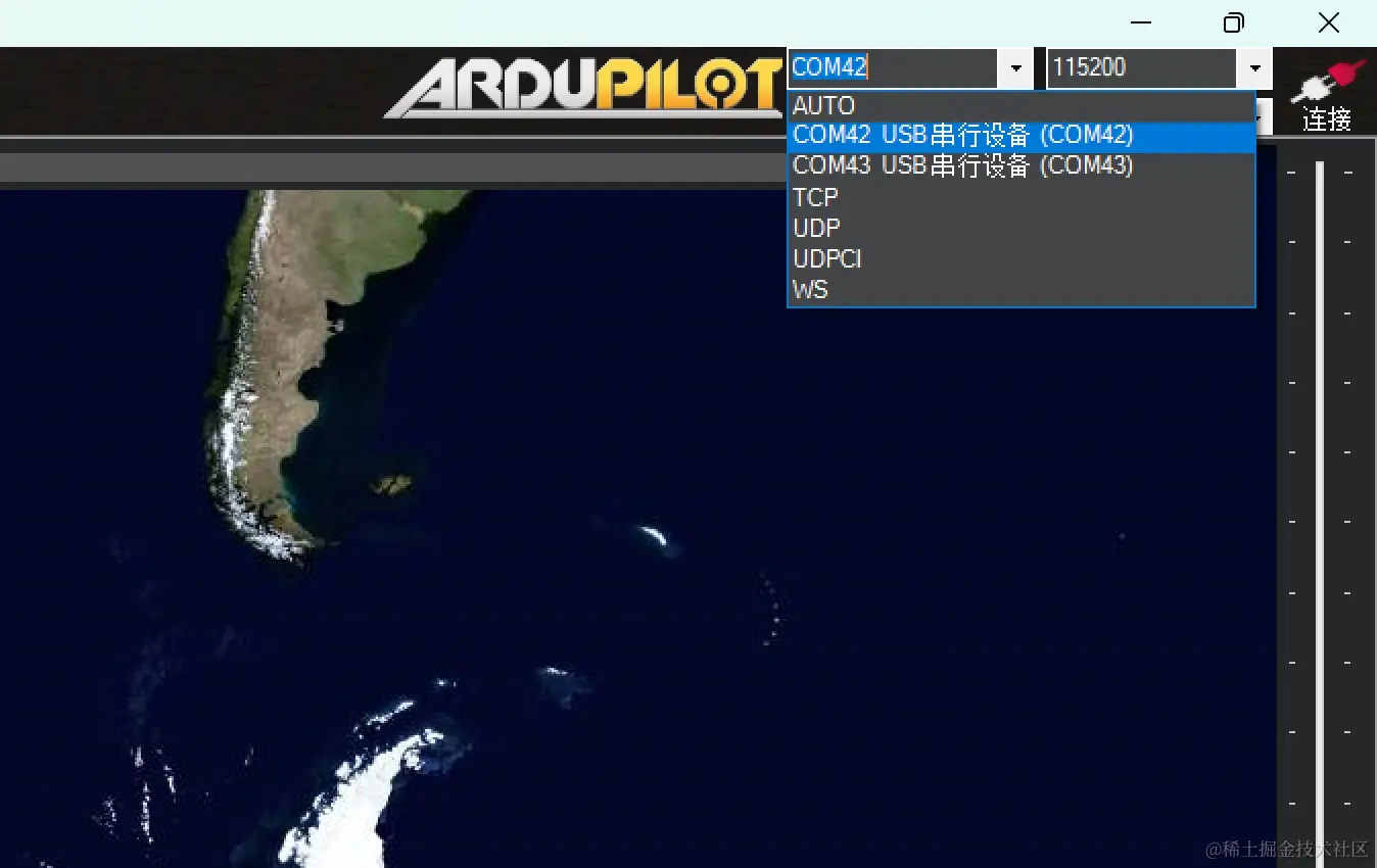 将磁力计连接到飞控的CAN1口,需要注意的是,请确保你的飞控已经开启了CAN总线支持和已经设置通讯协议为DroneCAN,如果你不确定你的飞控是否完成了该设置,你可以查看ardupilot文档来检查你的飞控,文档链接:ardupilot.org/plane/docs/… ,然后用typeC线将飞控连接到电脑,打开MissionPlanner,选择对应的COM端口和波特率,点击连接,等待MP与飞控完成连接。