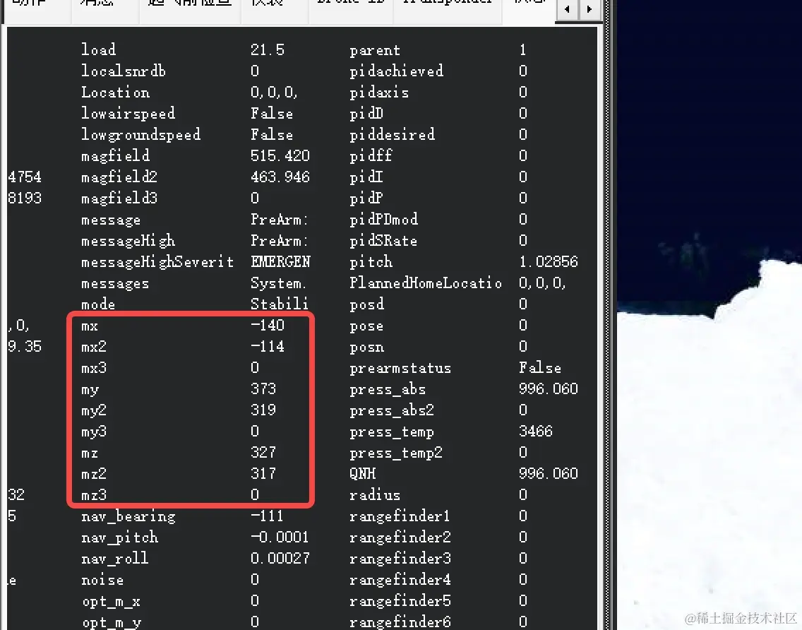 再切换到飞行数据 -> 状态栏,找到mx1,mx2,my1,my2,mz1,mz2 状态,其中无后缀的是飞控的内置磁力计,有后缀2的是我们的外置磁力计模块,这个顺序与我们上文提到的顺序一致,可以看到mx1和mx2,my1和my2,mz1和mz2 基本一致,但存在一定的可接受的误差,这说明我们的外置磁力计模块的数据是正常的,即与飞控内置磁力计模块的数据保持一致。注意,此时外置磁力计模块已经与飞控朝向一致的固定连接在一起,但如果你和我一样是用手将它两按在一起,那么查看数据时记得确保将它两朝向一致的按在一起。