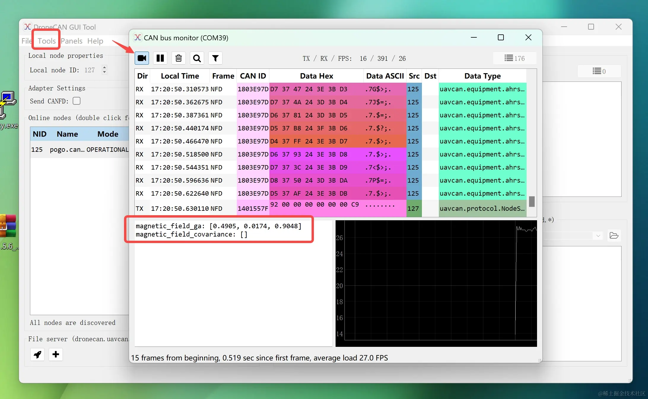 使用DroneCAN调试器和DroneCAN_GUI_Tool查看磁力计的数据