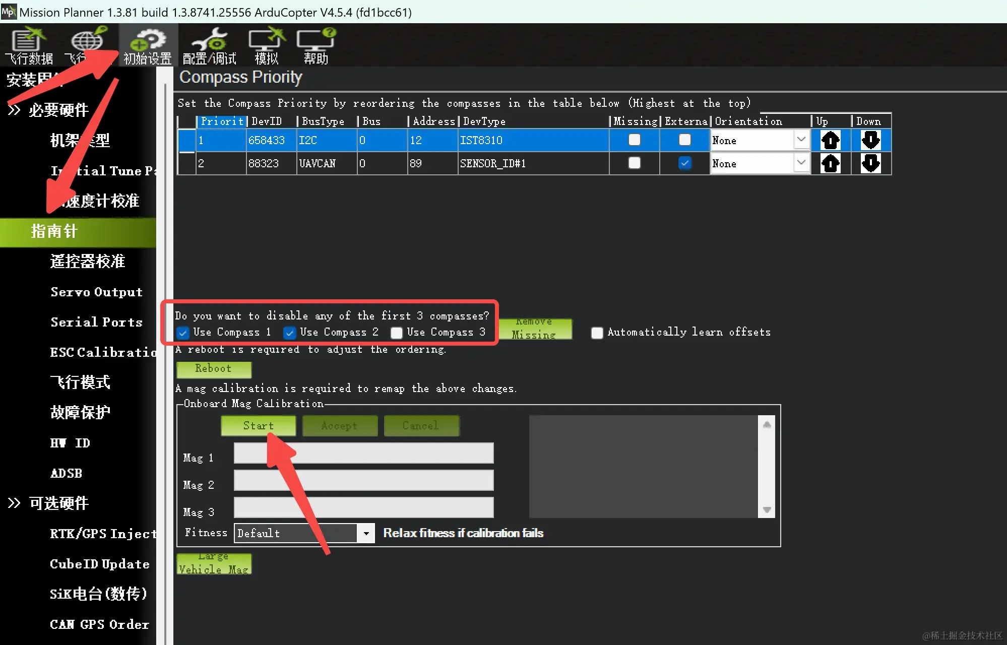 在查看外置磁力计的数据前,我们需要将外置磁力计和飞控朝向一致的固定连接在一起,并对外置磁力计和内置磁力计都进行校准。我这里仅作演示,因而用手将磁力计和飞控按住在一块。然后切换到初始设置->必选硬件->指南针界面,在这里也可以看到飞控识别到了我们的外置磁力计模块,在开始校准前,请确保你勾选了对应的Use Compass X,比如我这里将Use Compass1 和 Use Compass2 勾选上,然后点击下方的Start开始校准磁力计。