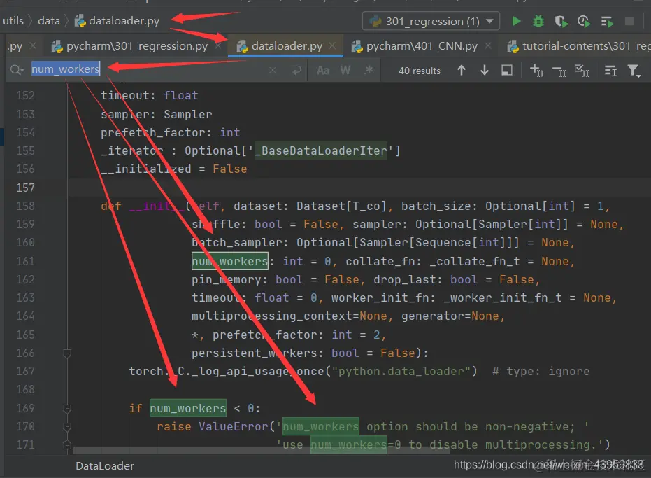 如图就是网友说到的dataloader文件了, 直接点击就可以进入文件中.网上的答案是这样的, 就是说改变下面这个变量num_workers的值为0就可以了