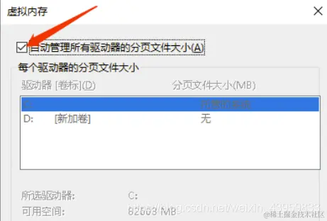 先说下这个问题的存在, 我们看下下面的这张图, 会发现电脑默认情况下是没有给D盘分配虚拟内存的, 所以将Python装在D盘的朋友, 在跑程序时, 没有分配虚拟内存, 自然就遇到了上面的问题, 所以根本操作只要给D盘分配虚拟内存即可.(如果Python安装在C盘, 就更改C盘的虚拟内存的值, 调大点)