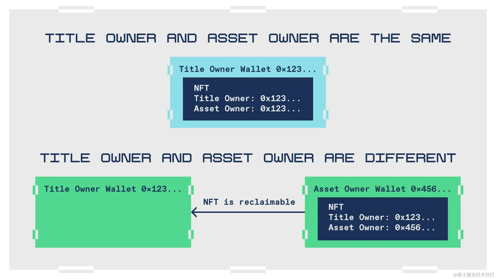 每个 NFT 都有两个可能不同的所有者,我们称之为资产所有者和所有权所有者: