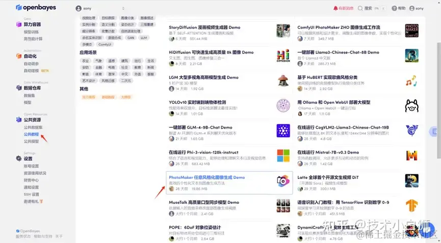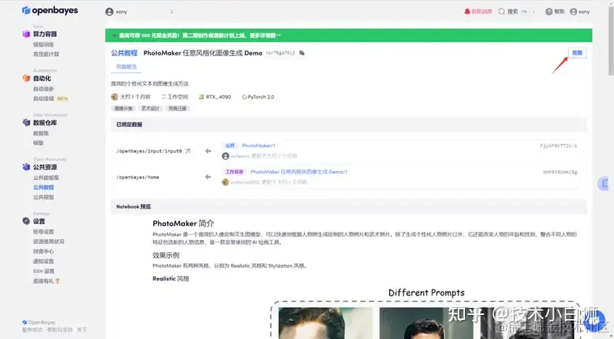 登录 OpenBayes 平台,打开「公共教程」,找到「PhotoMaker 任意风格化图像生成 Demo」的教程。