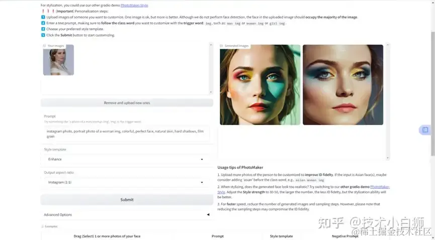 选择一个示例,将图像移除后添加我们自己的图像,点击 Submit 生成。