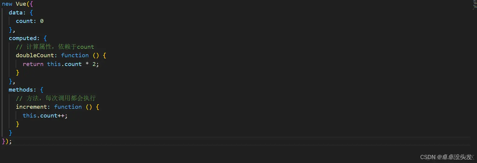 在这个例子中,doubleCount是一个计算属性,它会自动根据count的变化更新。而increment是一个方法,每次调用都会增加count的值。