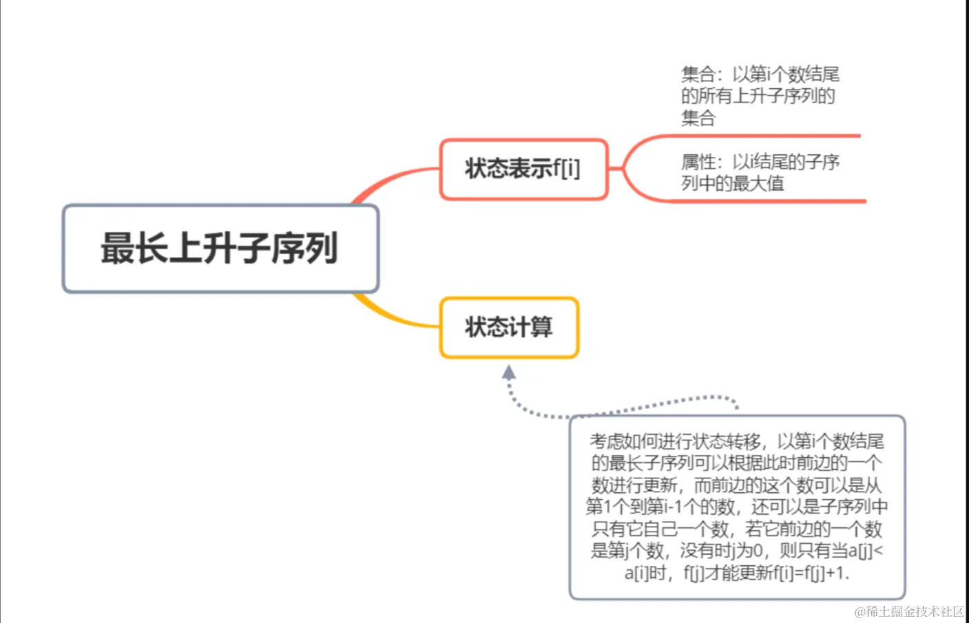 //求以i为结尾的最长上升子序列,就是求他的f[i - 1] 的最长上升子序列加上1,就是i本身
