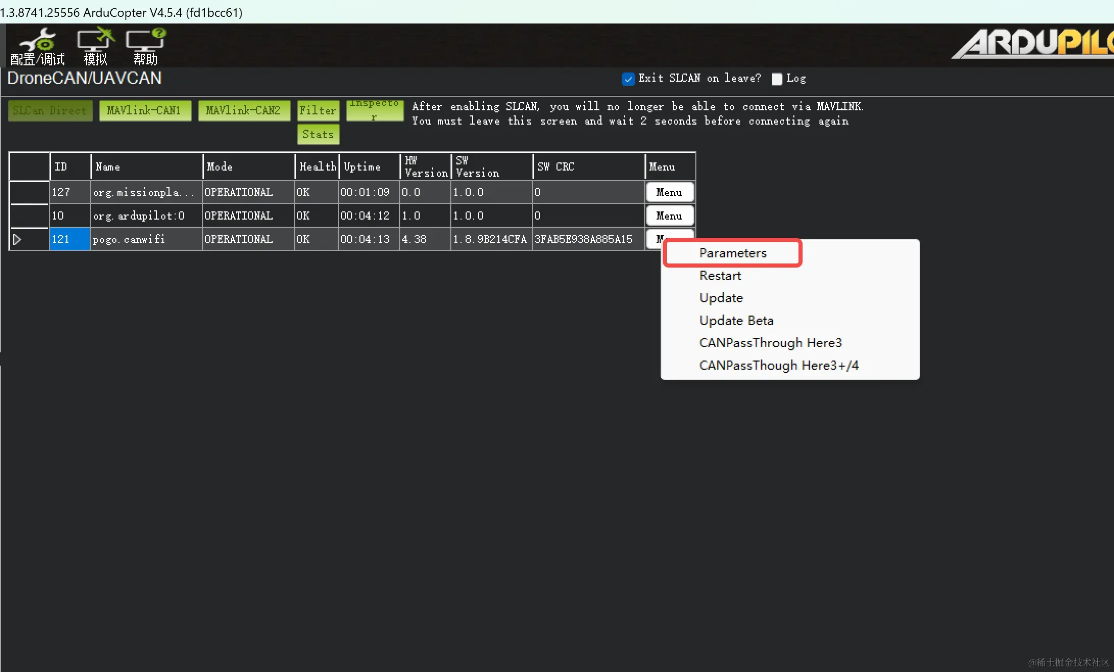 可以看到界面中加载出了Pogo-DroneCANWiFi数传节点,你可以点击最右侧的menu按钮查看节点的信息或对节点进行相关操作,比如在这里我们可以点击menu -> parameters 查看节点的所有参数,如同在DroneCAN_GUI_Tool 上位机中点击Fetch All 一样。