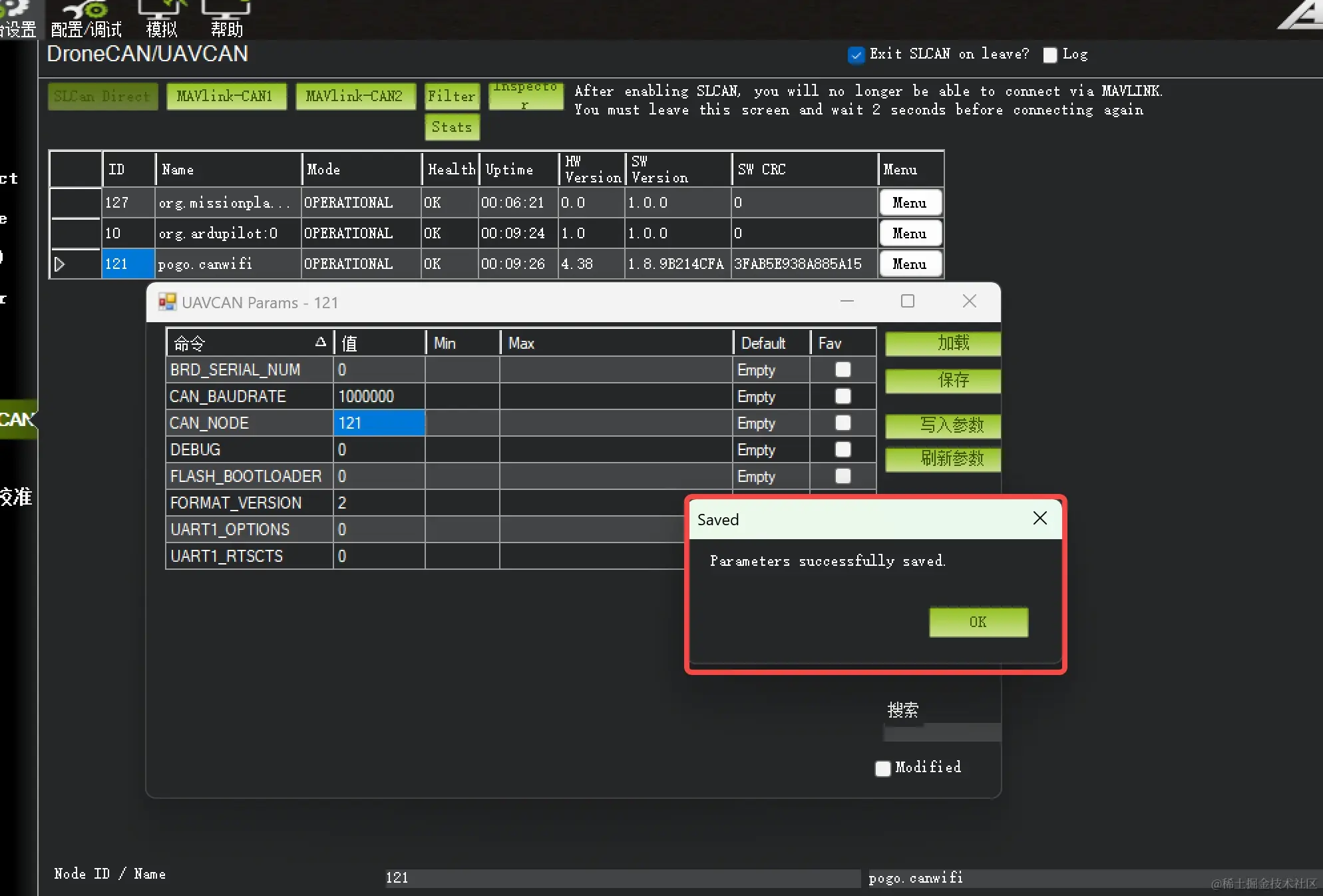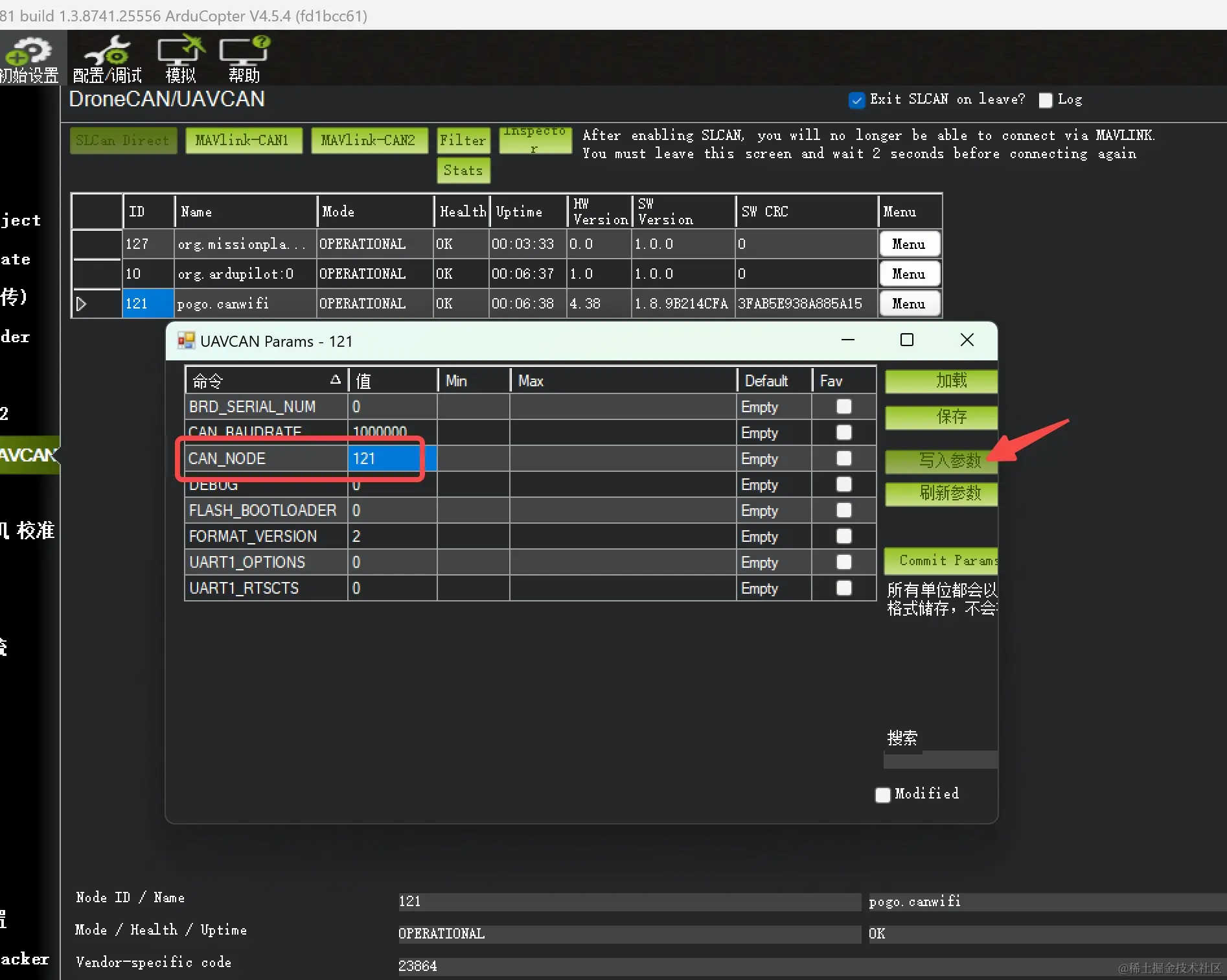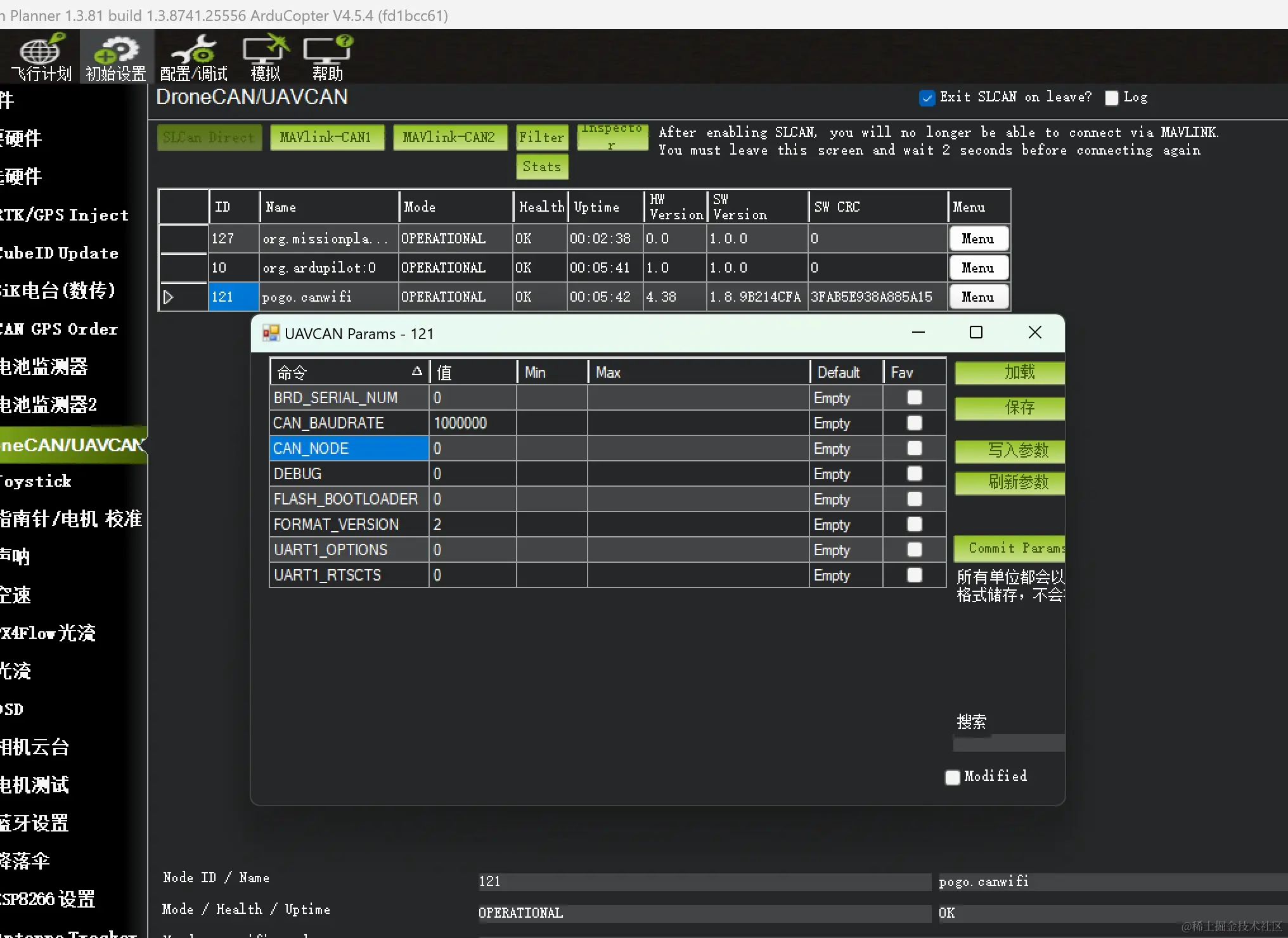 对于DroneCANWiFi数传模块,由于后续我们需要将该模块的NodeID设置为另一个飞控参数的值,所以这里我建议将DroneCANWiFi数传模块的NodeID设置为固定值,在Params界面修改CAN_NODE参数的值为121(1-126均可),点击写入参数,数据更新后给飞控和模块重新上电,并重新连接到MP。这里我们会注意到CAN_NODE的原始值为0,0的含义是让系统自动给该DroneCANWiFi数传模块分配NodeID。