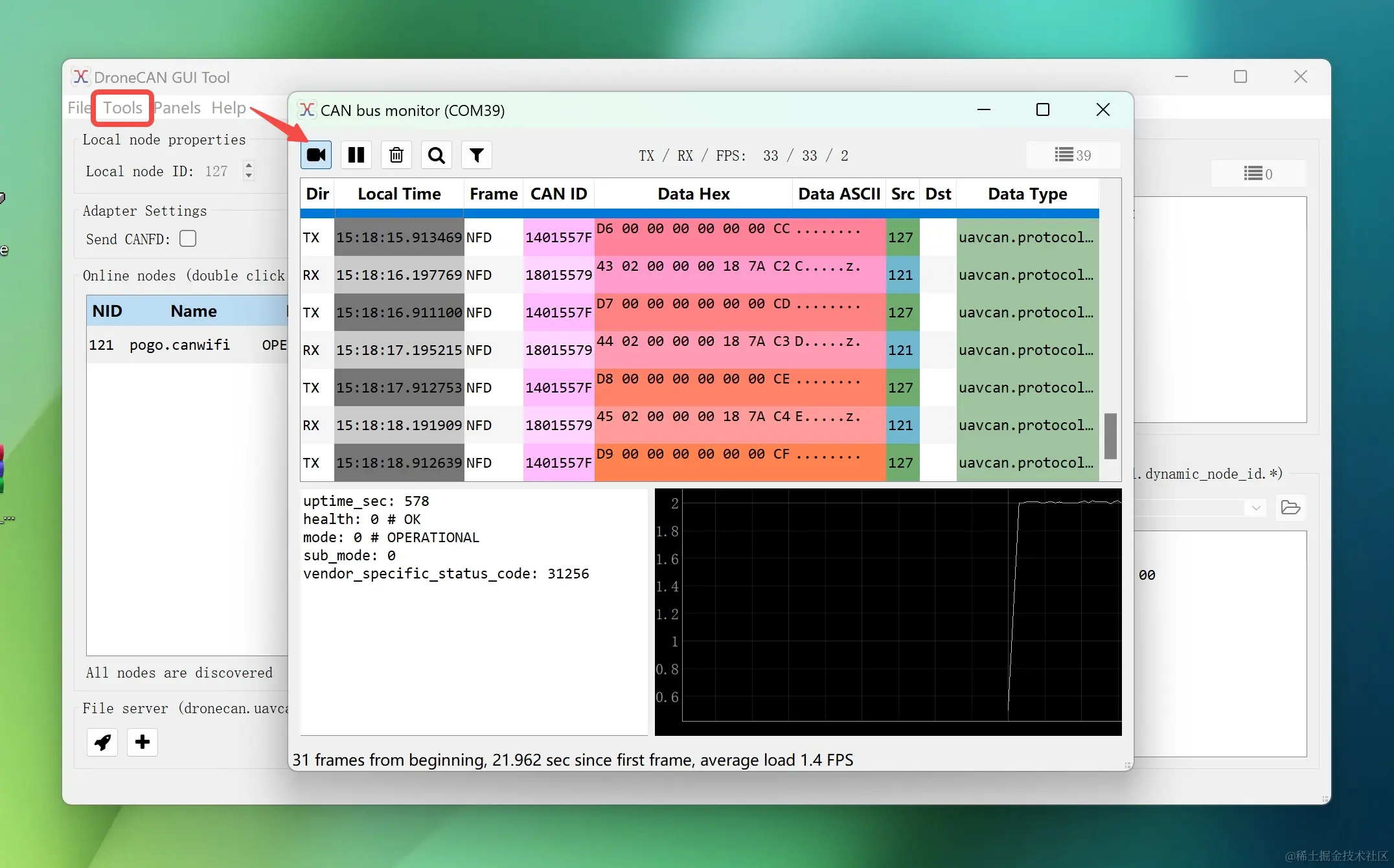 关闭Node属性页面,在Tools -> bus monitor 打开 bus monitor界面,在该界面点击左上角的摄像头icon,可以看到上位机收到了DroneCANWiFi数传模块发送的节点状态数据,任意点击一条查看它的详情。