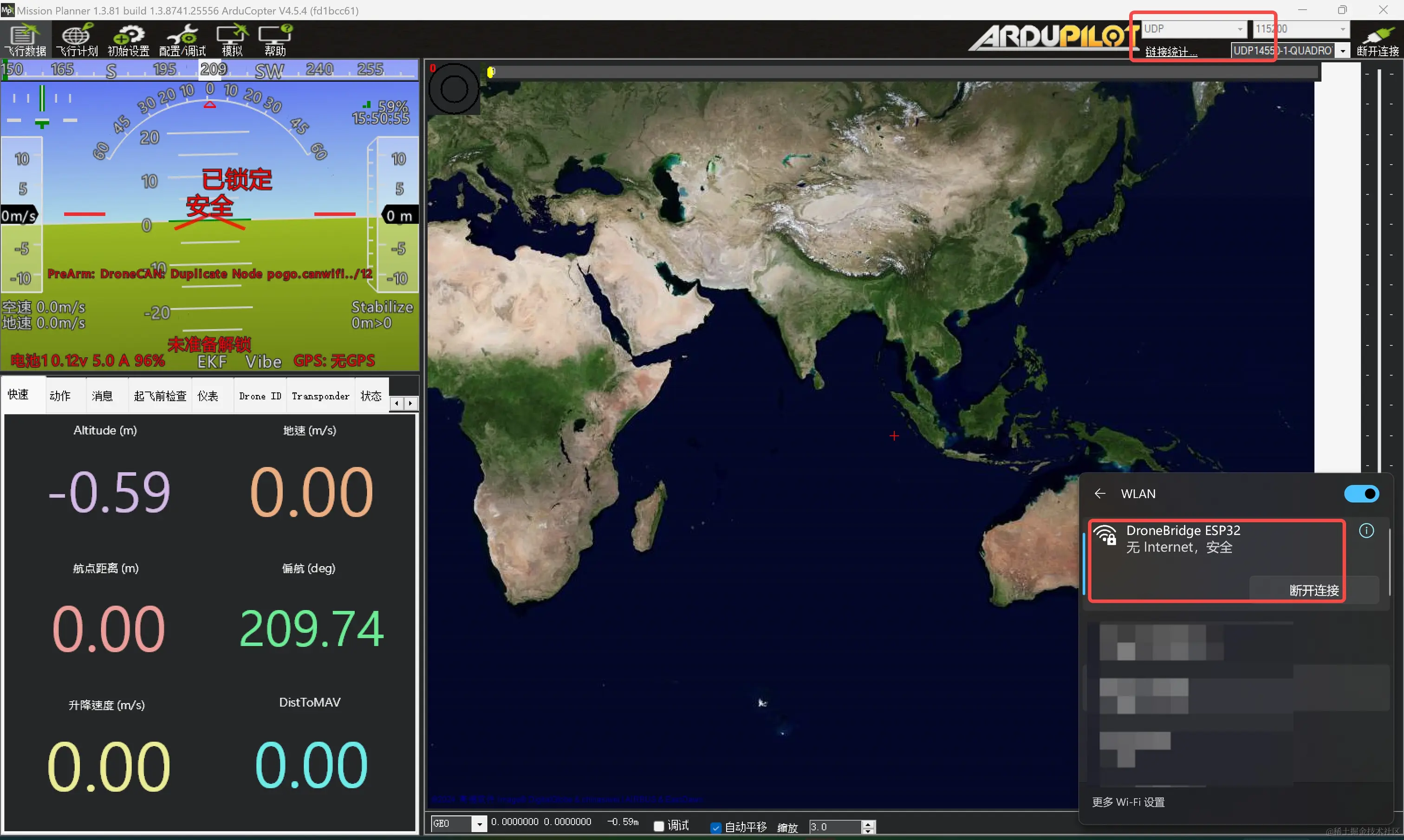 然后打开MissionPlanner,此时MP会自动通过UDP连接到飞控,如果你的MissionPlanner没有反应,那么你可以手动切换为UDP后点击连接,等待MP和飞控完成连接,这意味着DroneCANWiFi数传模块已经完全配置好了,并且MissionPlanner也通过UDP与飞控建立了连接。