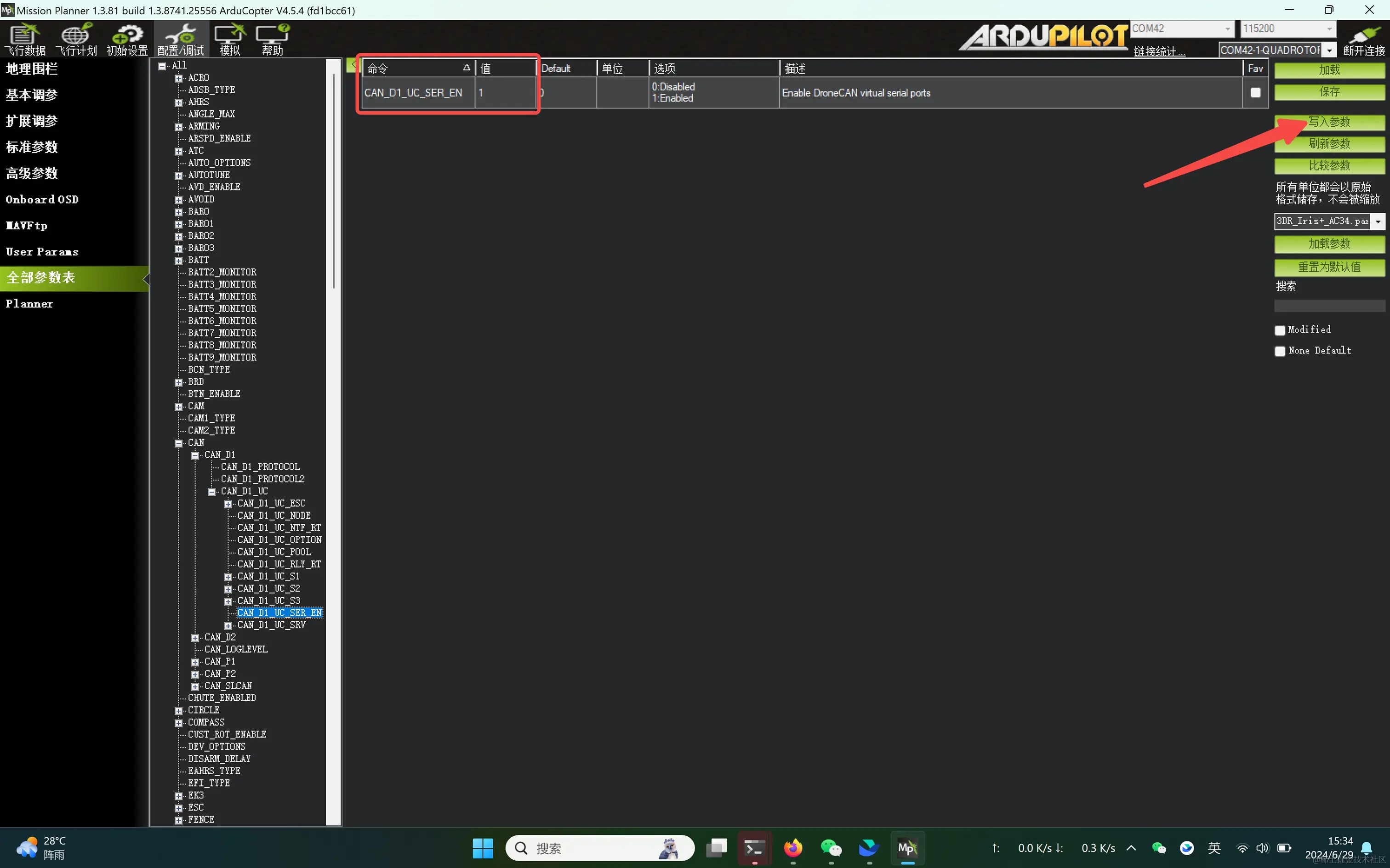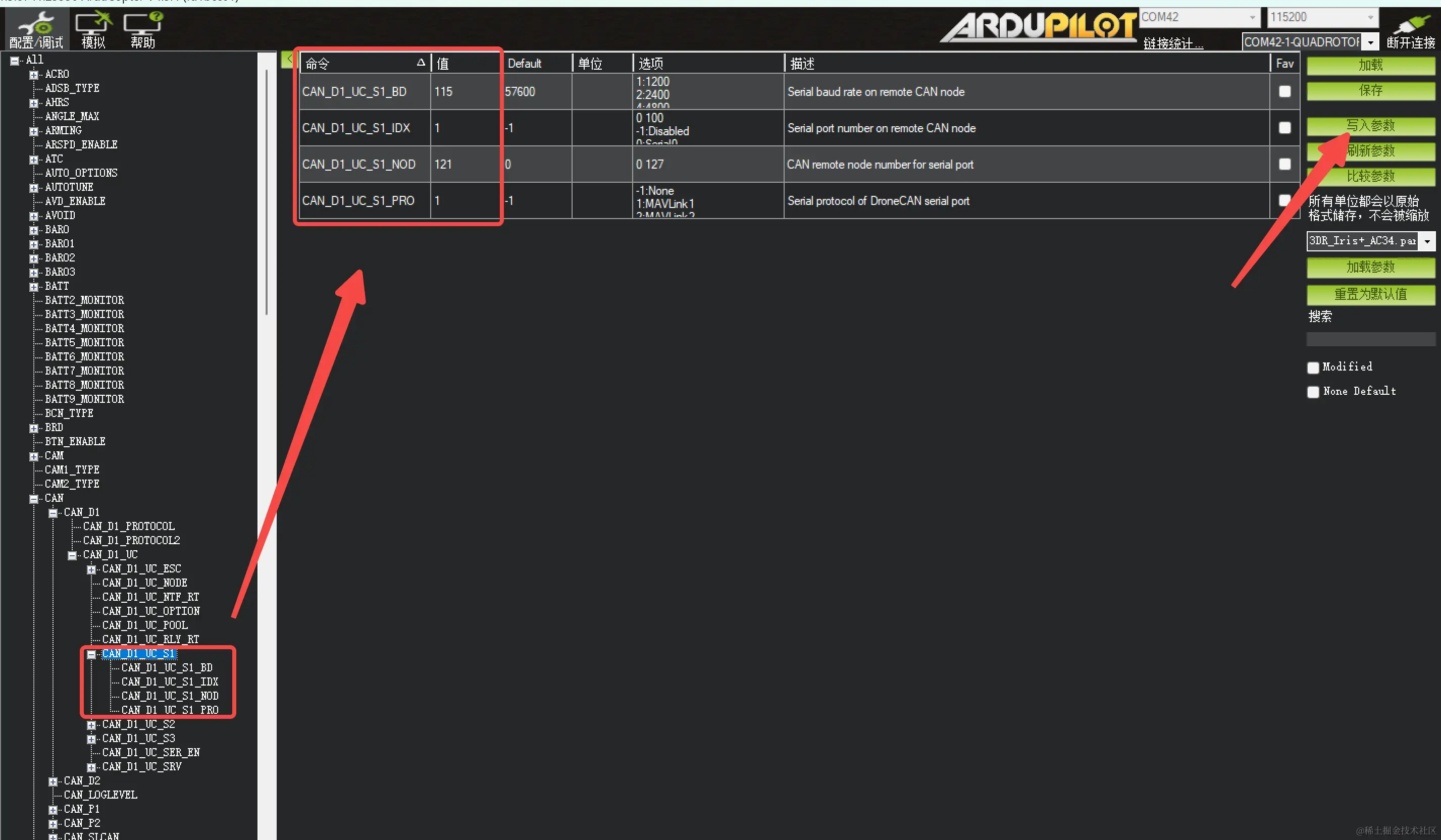 然后切换到配置/调试 -> 全部参数表 界面,在 CAN -> CAN_D1 -> CAN_D1_UC 下找到 CAN_D1_UC_SER_EN 参数,将该参数修改为1。请务必注意,在你进行这步操作之前,你需要开启飞控的CAN BUS支持并设置通讯协议为DroneCAN,查看ardupilot文档了解设置的详细教程,文档链接:ardupilot.org/plane/docs/…,我这里提供一个设置示例:CAN_P1_DRIVER = 1,CAN_D1_PROTOCOL = 1。 然后点击右侧的写入参数,写入完成后给飞控和模块重新上电,并重新连接到MissionPlanner。