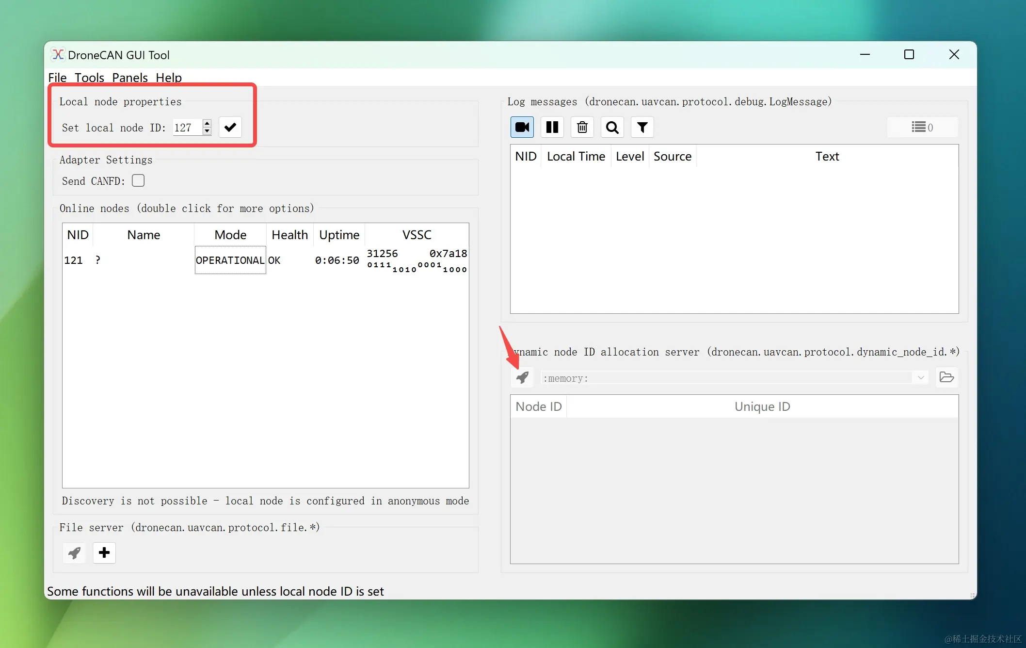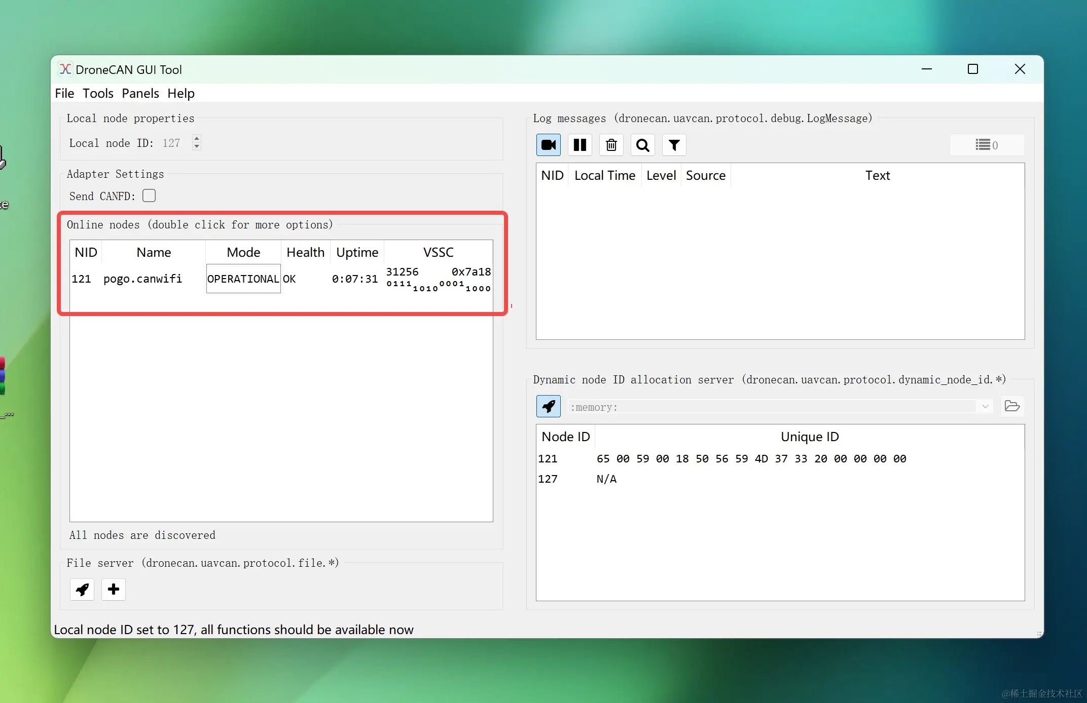 在电脑上打开DroneCAN_GUI_Tool上位机,选择STM...Virtual COM Port,进入上位机后,依次在左上角设置local NodeID,在右下角点击小火煎icon(该操作的作用是给连接到DroneCAN调试器的DroneCAN外设自动分配NodeID),可以看到识别出了Pogo-DroneCAN WiFi数传模块。