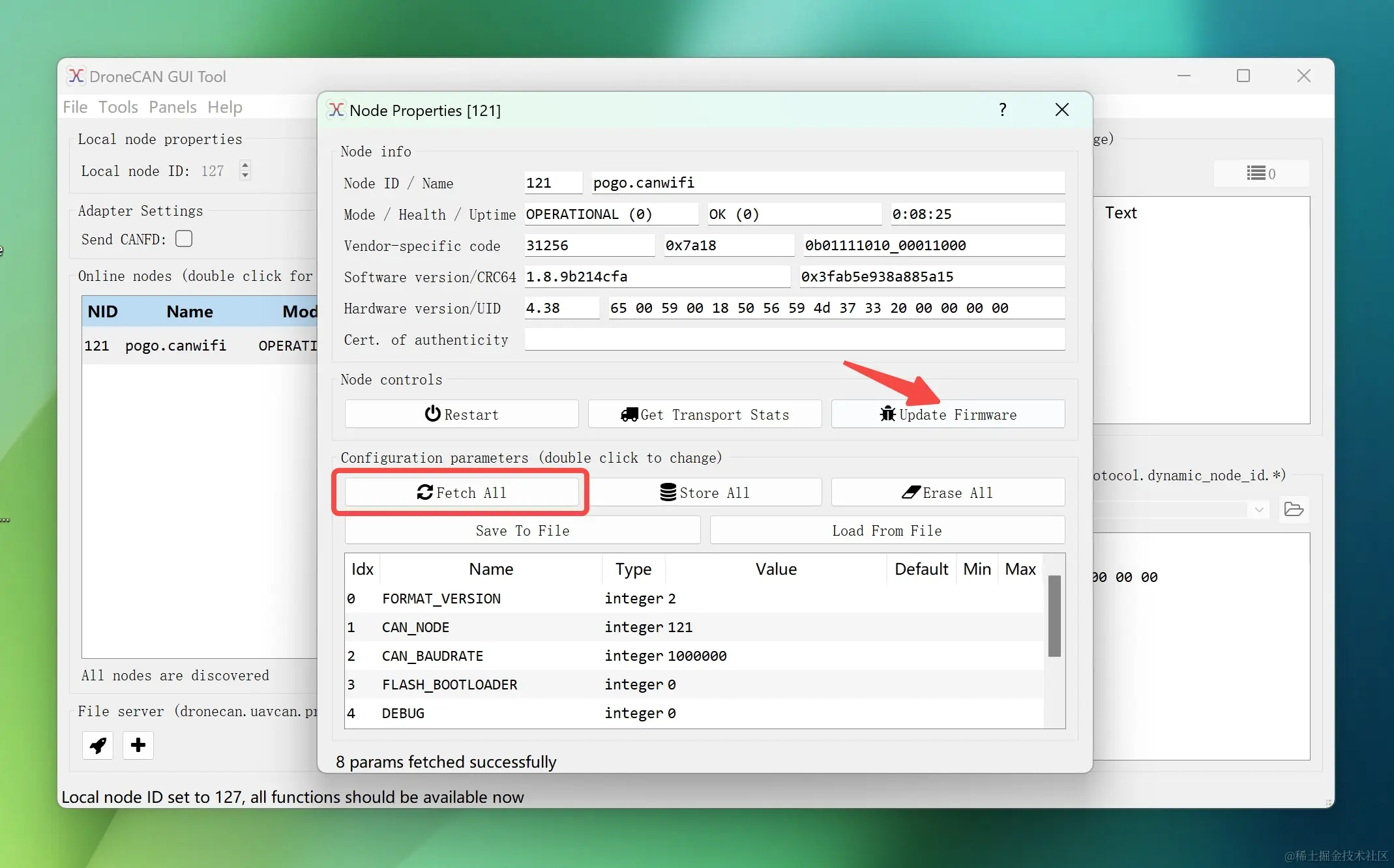 双击该Pogo-DroneCANWiFi节点,DroneCAN_GUI_Tool会为该节点打开一个Node属性界面,你可以在该界面点击FetchAll查看和修改DroneCANWiFi数传模块的所有参数,也可以点击Update Firmware更新该WiFi数传模块的固件。Pogo智能科技的该款DroneCANWiFi数传模块目前不需要修改任何参数。