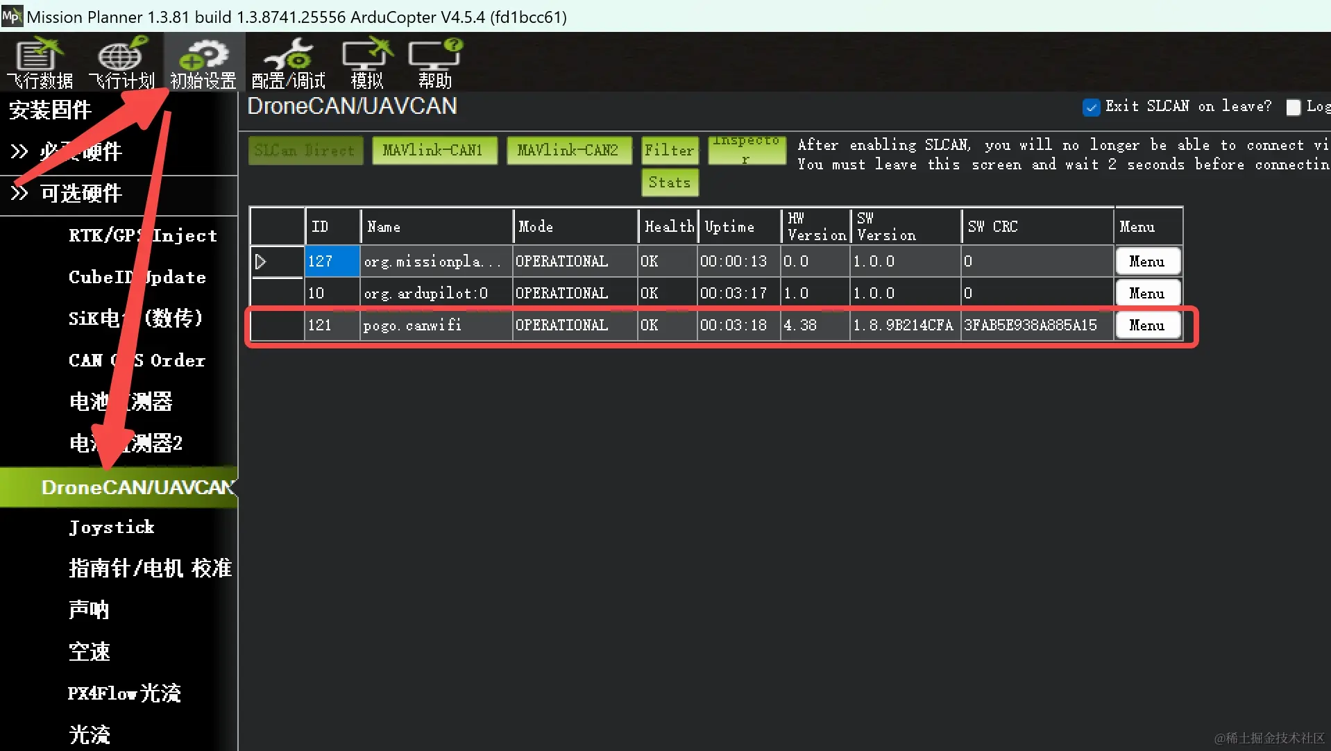 在初始设置 -> 可选硬件 -> DroneCAN/UAVCAN 界面点击 MAVlink-CAN1,MP会加载目前连接到飞控的DroneCAN节点。如果你的飞控开启了Slcan Direct支持,那么你也可以点击 Slcan Direct 来加载DroneCAN节点,但一般情况下,除非有特殊需求,否则我们比较少开启Slcan Direct 支持。