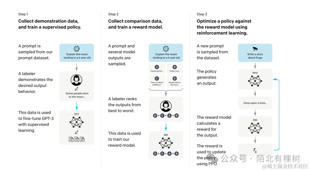 下图是InstructGPT论文中RLHF的步骤图,包括三个部分:待对齐的有监督微调模型、基于人类反馈数据的 奖励建模、强化学习,其中“待对齐的有监督微调模型”是前面两步训练后得到的模型,本节重点以InstructGPT为举例介绍后面两步,更详细的内容(比如DPO、LLaMa中的RLHF、以及其他对齐技术等)会在后面章节进行详细展开。