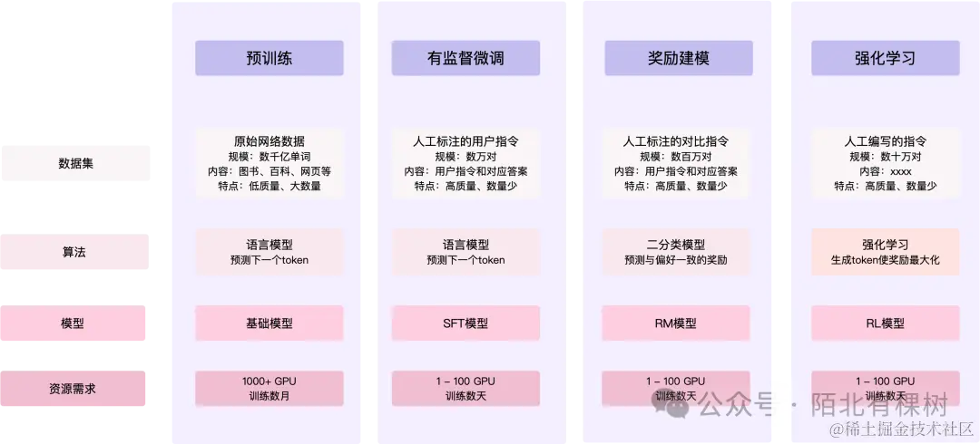 四个阶段中,需要的数据集、训练方式、算力资源、以及产出的模型都是不同的。下图是一个概括说明: