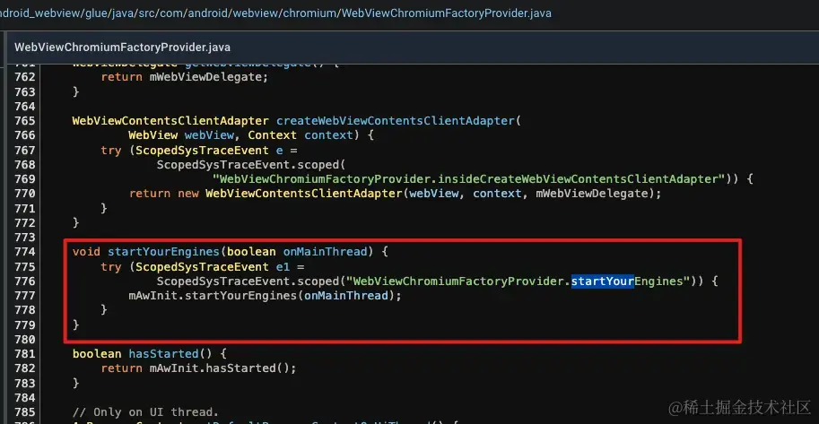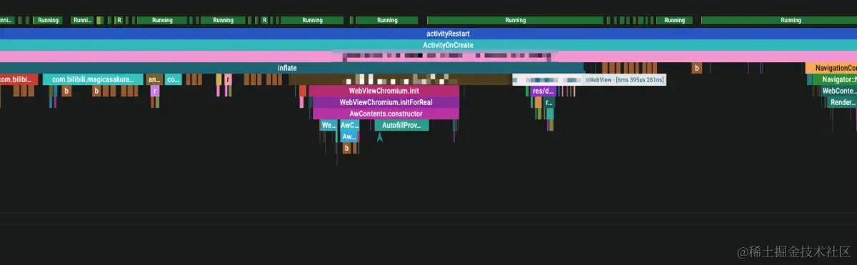 那么不难得出这个方法被混淆了,无法通过反射访问了。由于这个类是Android系统提供的,对此应用端无法keep。因此提前反射调用WebViewChromiumFactoryProviders.startYourEngines 在实际运行中是无效的,后续的Prefetto图也证明了这个结论。