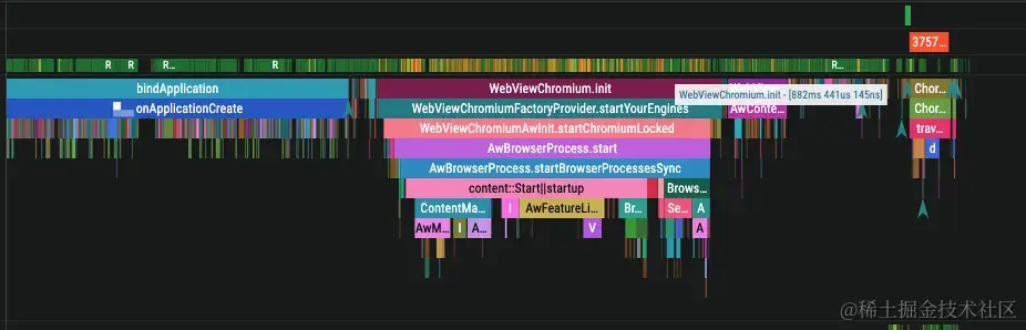 可以看到,bindApplication后WebViewChromium新建花费的时间是882.4ms。