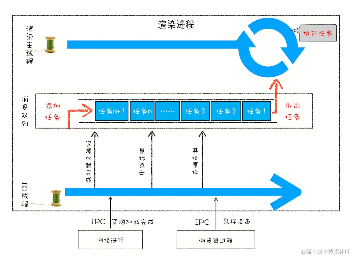 - 如果其他进程想要发送任务给页面主线程,那么先通过 IPC 把任务发送给渲染进程的 IO 线程,IO 线程再把任务发送给页面主线程。