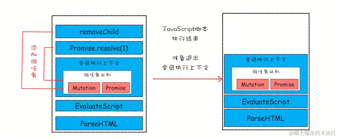 通常情况下,在当前宏任务中的 JavaScript 执行完成时,也就是 JavaScript 引擎准备退出全局执行上下文并清空调用栈时,会检查微任务队列并执行。