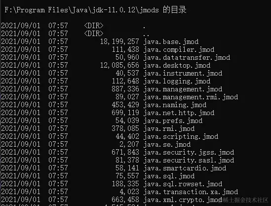 可以看出 Java 9 中没有jre,没有rt.jar,没有tools.jar,而是多了一个 jmods,该文件夹下都是一个一个的模块: