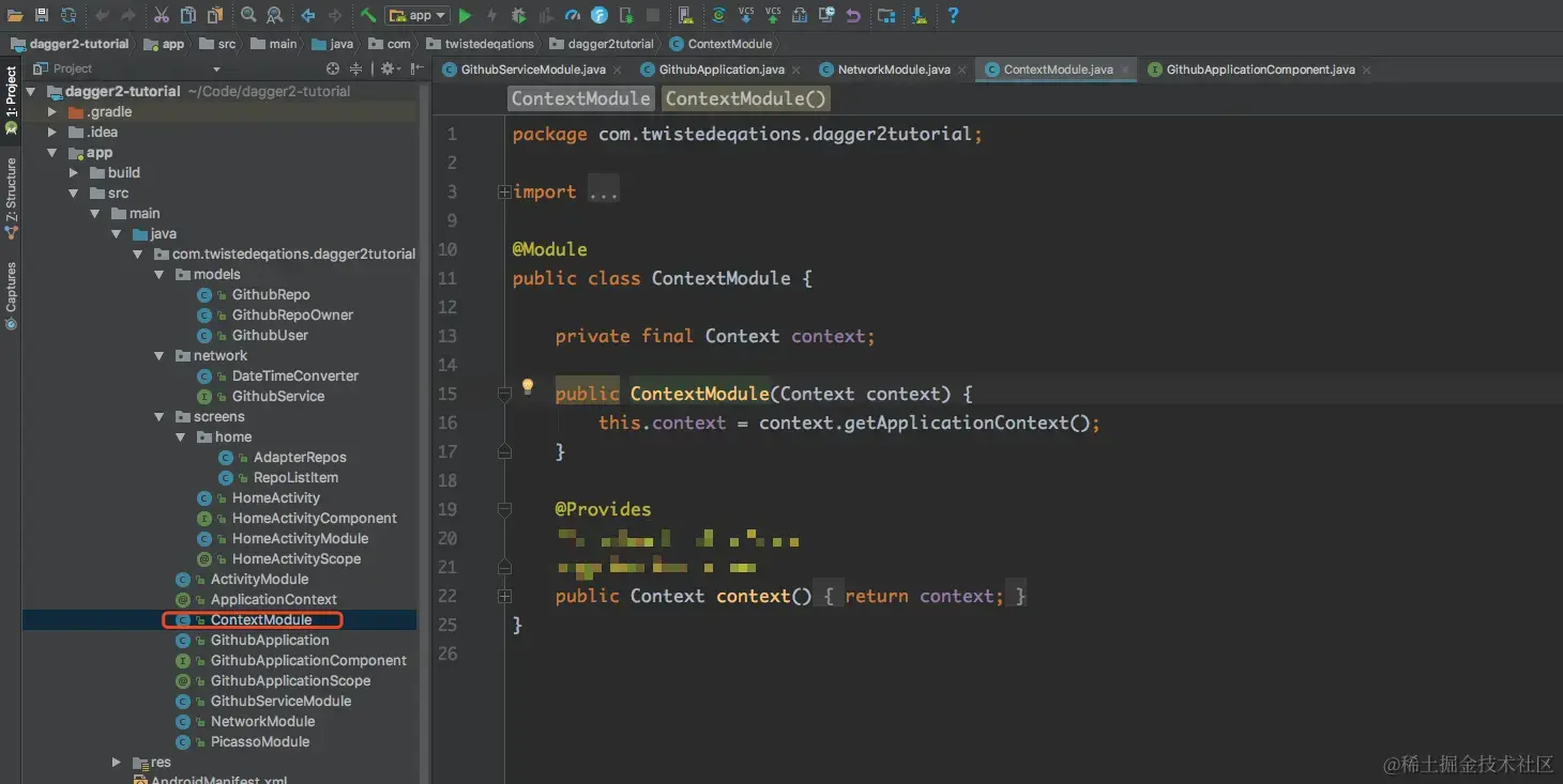 可见必要的提供Context的context()的方法还是有的,而且用@Provides注解。至于这个ContextModule是什么时候被初始化的,通过什么样的方式传入到Dagger里面的,这个我们稍后再讲。