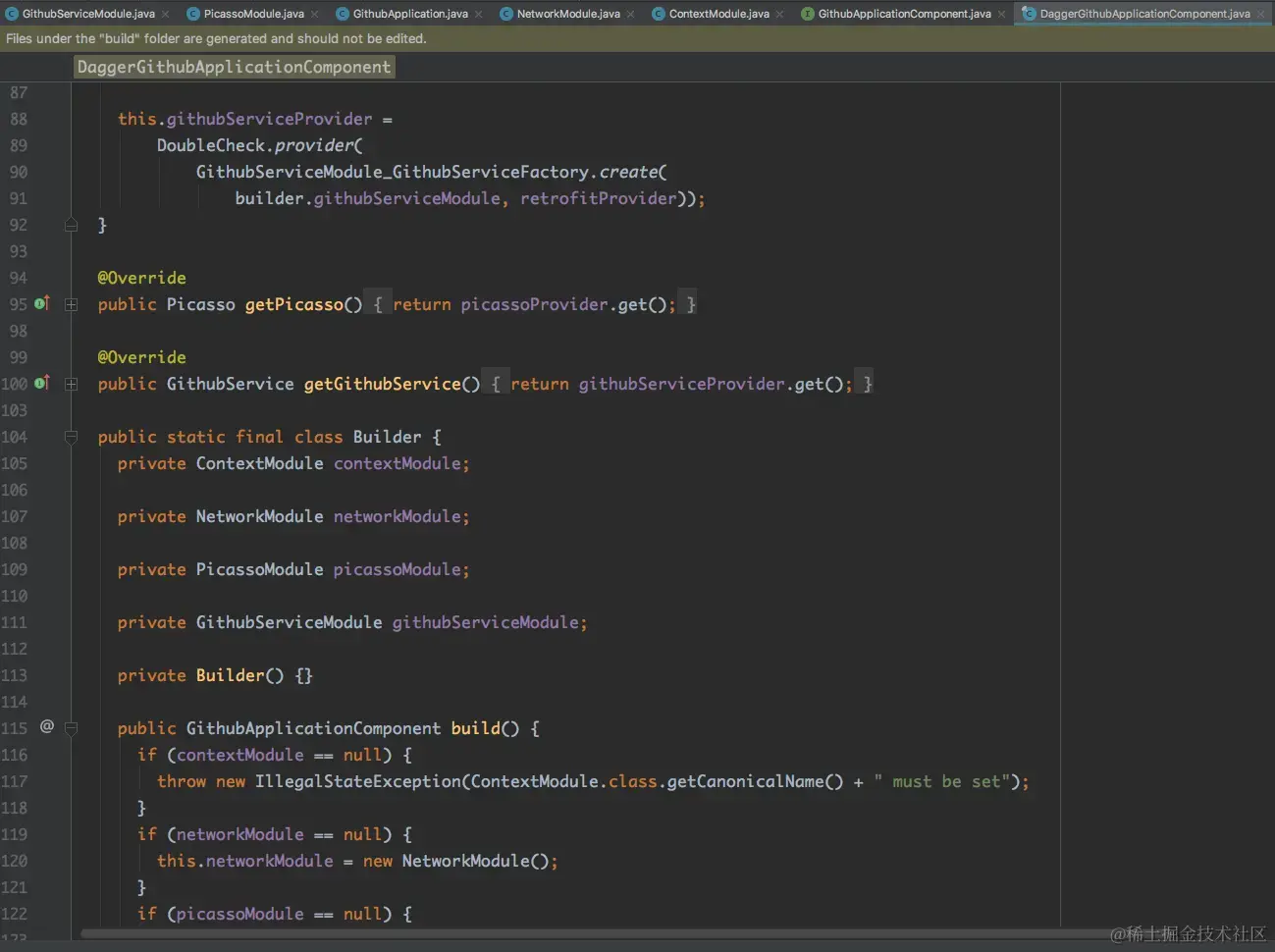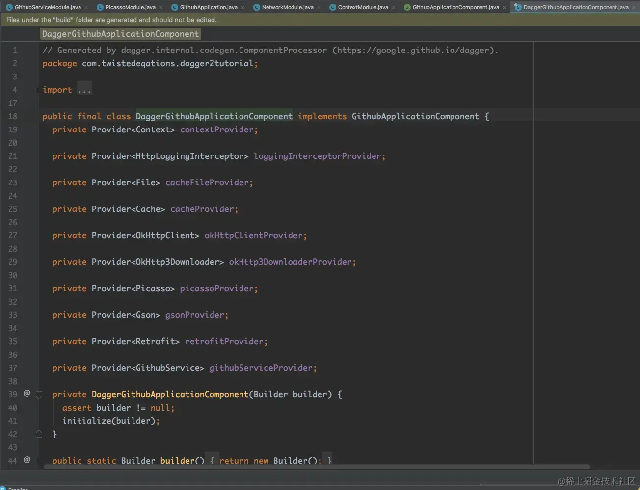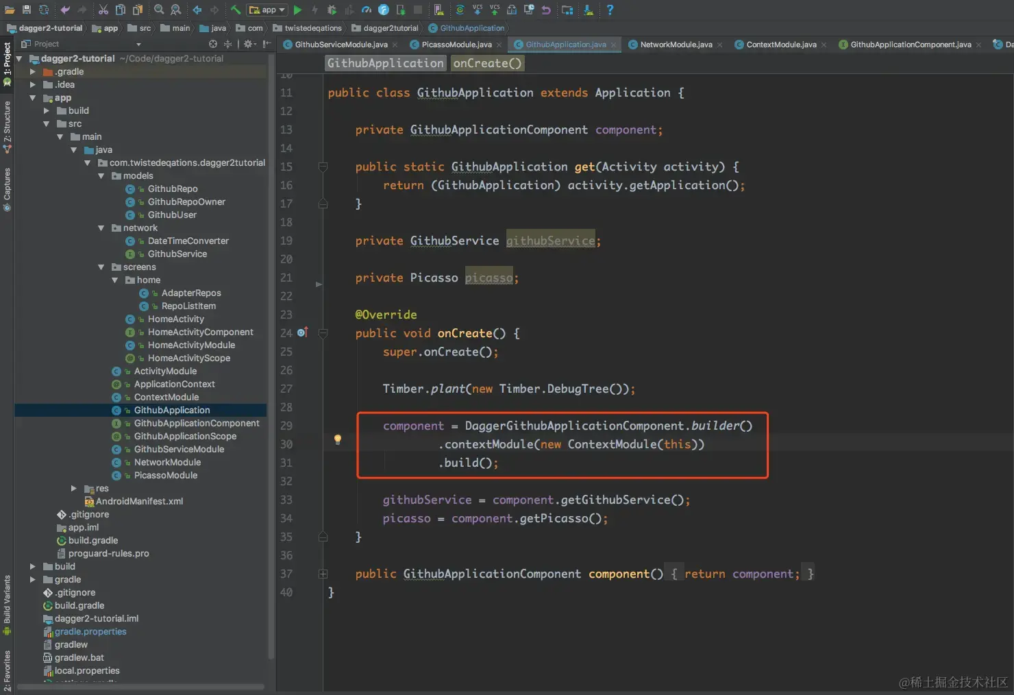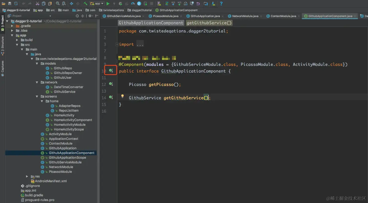 为了使用Dagger为我们生成的类,我们就必须创建GithubApplicationComponent的实例。代码如下: