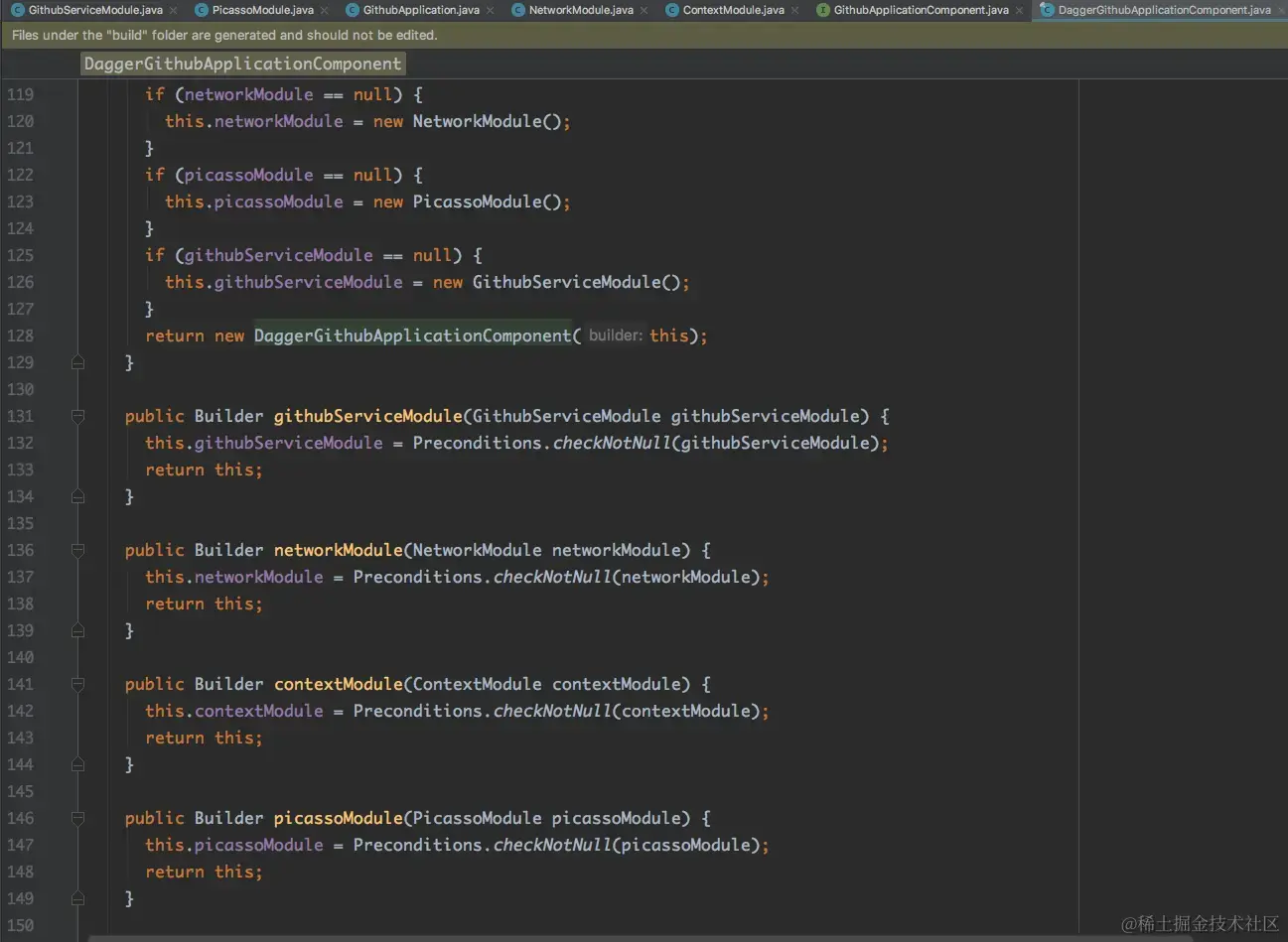 如果你会看上面Dagger帮我们生成的代码时,里面build()方法,你就会发现,Dagger会检查需要的类,如果为空就帮我们生成所需要的类。唯一一个一旦为空就抛出异常的的Module就是ContextModule,因为Dagger并不知道如何创建这个类。