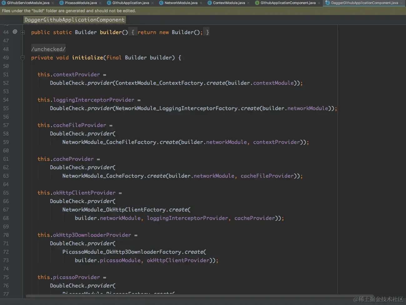 可以看到Dagger生成了提供各个类的Provider,在initialize()中的初始化顺序是按照正确的逻辑顺序生成的,虽然我们并没有指定它的顺序,这一切都是Dagger自动完成的。