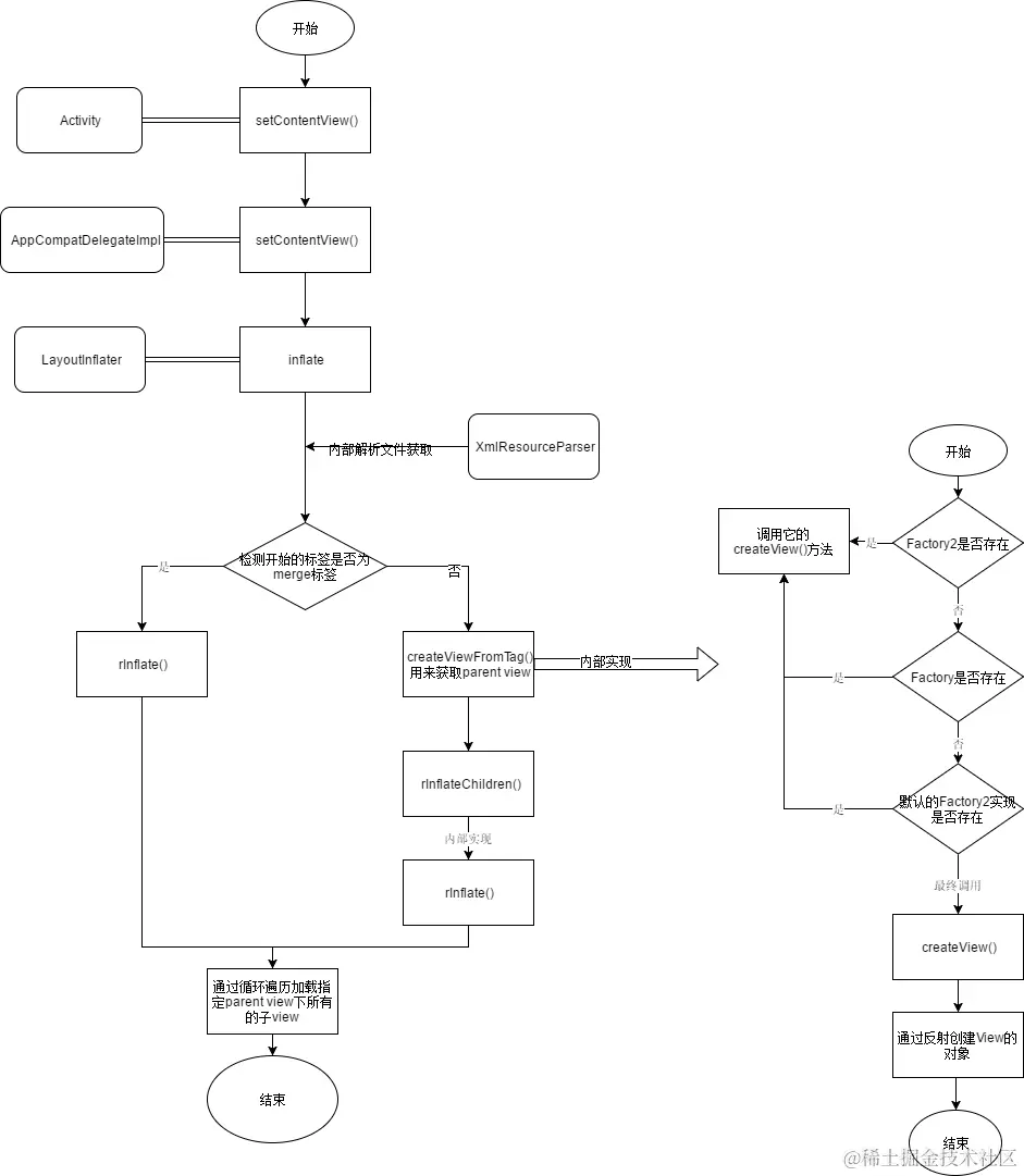 merge,如果不是,则先使用createViewFromTag创建父标签对象;否则直接调用rInflate方法以循环遍历的方式来创建 View 对象。需要注意的是,rInflate方法内部,也是通过createViewFromTag方法来创建对应的 View 的 - 在