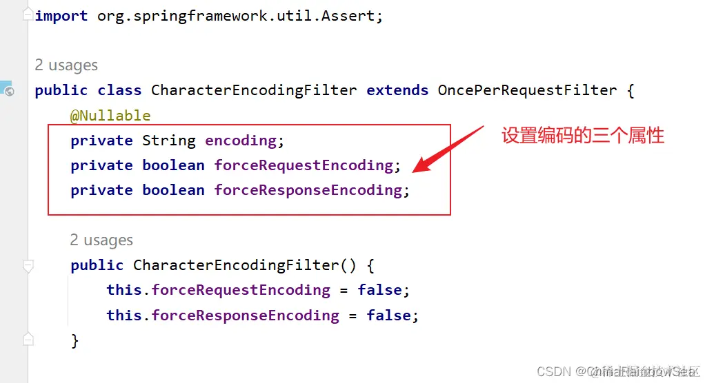 这里是第二种方案:没错,我相信大家想到了:过滤器Filter。过滤器Filter可以在Servlet执行之前执行。有同学又说了:监听器不行吗?不行。因为我们需要对每一次请求解决乱码,而监听器只在服务器启动阶段执行一次。因此这里解决每一次请求的乱码问题,应该使用过滤器Filter。并且,告诉大家一个好消息,SpringMVC已经将这个字符编码的过滤器提前写好了,我们直接配置好即可:CharacterEncodingFilter,我们一起看一下它的源码: