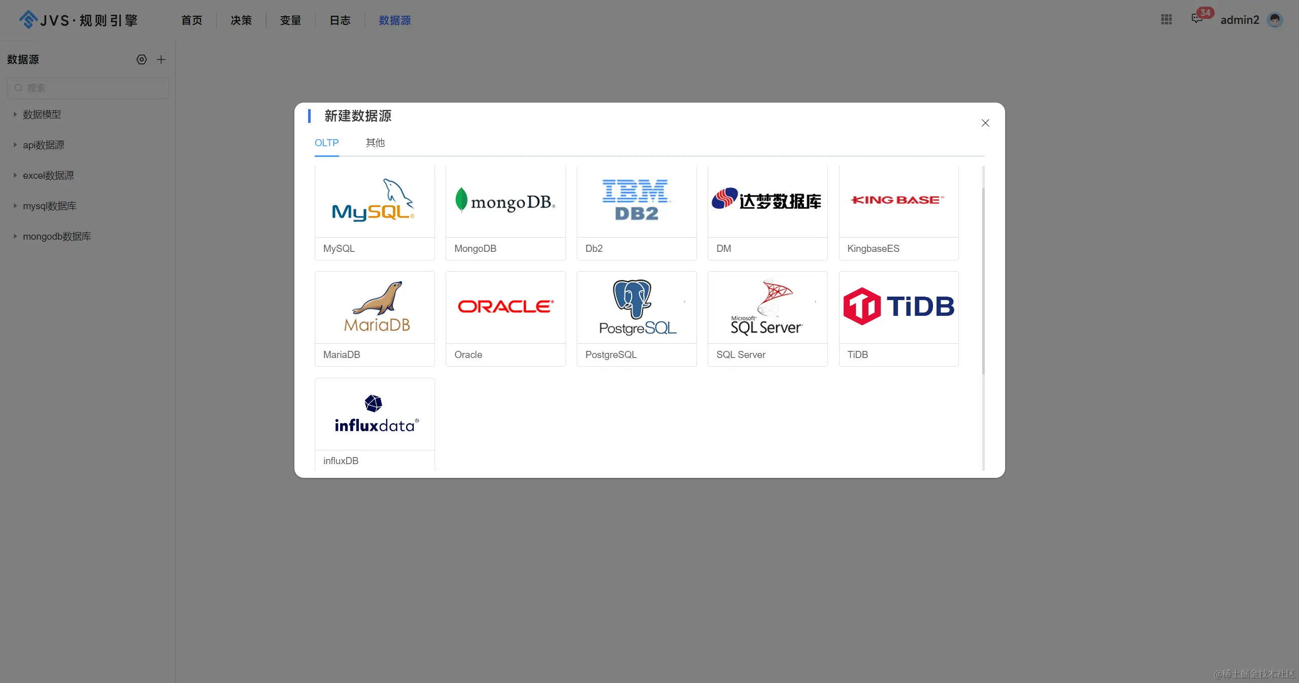**4、数据源,**规则引擎中现已支持MySQL、MongoDB、Db2、人大金仓、Excel、API、低代码等等,可扩展。