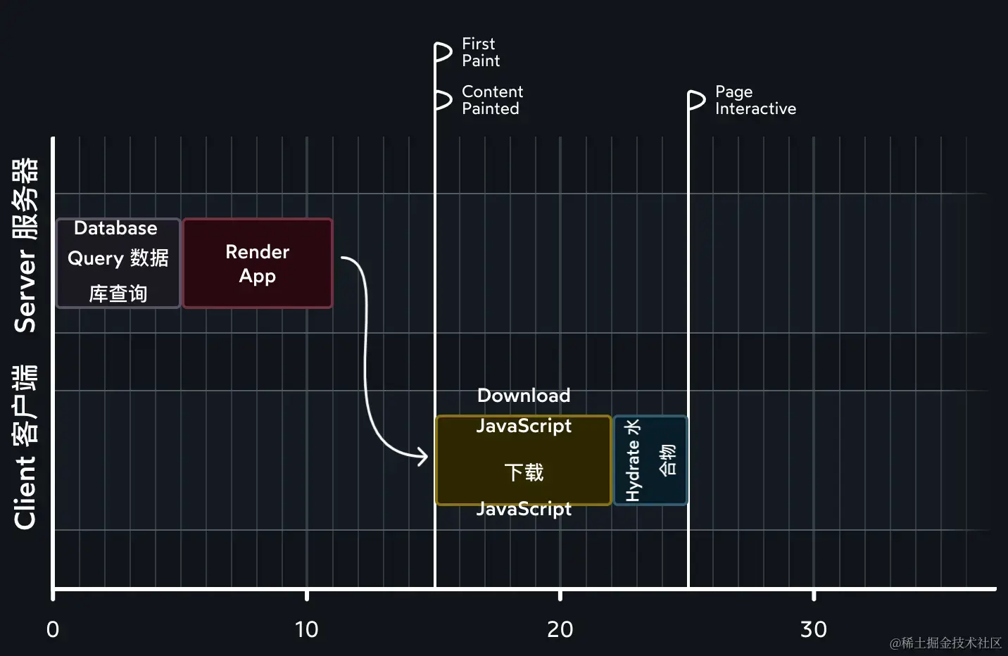 React Server Component简称RSC ,主要目的是在服务端获取接口数据或数据库数据,提升性能。通常RCC(客户端组件)我们请求数据是在useEffect中,此时组件已经渲染过一次,请求完数据,又再渲染一次,过程比较繁琐。RSC的出现改变了这个现状,数据请求直接在RSC中处理,再通过SSR渲染,浏览器只需负责下载和渲染html页面,如下图。目前next13已经实现了服务端组件,性能对比next12得到了极大提升。