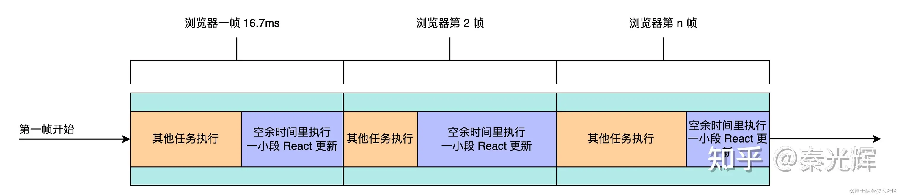 在18版本之后,渲染模式发生了变化,也就是并发更新,在react更新过程中渲染可以被中断,如下图,在一帧执行内优先执行高优先级任务,执行完高优先级任务后如果一帧还有剩余时间,则执行react更新,如果剩余时间用完,则中断react更新,继续执行其他任务,以此内推,这样就实现了ract并发更新。(高优先级任务有:用户输入响应、动画执行等)