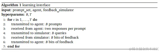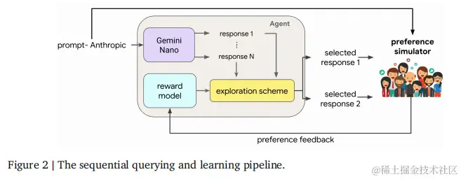 为了模拟人类如何在回答之间做出选择,论文使用了一个奖励模型,对每个提示-回答对进行评分。对于每个查询,根据Bradley-Terry选择模型,根据分配给两个提示回答配对的分数,抽样一个偏好。这个模拟器使用的奖励模型适合于人类主义的数据集,其架构重用了Gemini Pro语言模型的主干。进一步的细节在附录a中提供。请注意,由于Gemini Pro比Gemini Nano大得多,选择是由一个比代理可用的模型复杂得多的模型做出的。这种规模上的差异旨在反映这样一个事实,即人类可能表现出比主体所模拟的更复杂的行为。算法1提供了在论文的学习pipeline中对交互的简明演示——特别是向代理和模拟器传输和接收的东西。