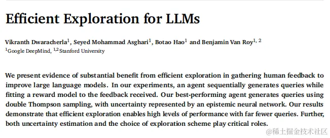 论文提出的证据表明,通过有效地探索收集人类反馈以改进大型语言模型有实质性的好处。在论文的实验中,一个代理依次生成查询,同时拟合一个奖励模型的反馈收到。论文的最佳性能代理使用双汤普森抽样生成查询,其不确定性由一个认知神经网络表示。论文的结果表明,有效的探索可以用更少的查询实现高水平的性能。此外,不确定性估计和探索方案的选择都起着关键作用。
