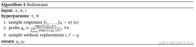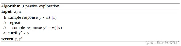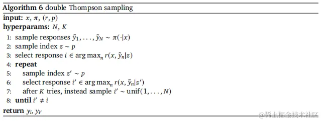 直观地说,双TS(算法6)的目标是选择两个回答,每个回答都有机会成为最优的。就像算法4和算法5一样,论文首先采样N个回答。然后,在N个回答中选择两个,这两个是通过从p中抽取两个认知指数,并最大化每个指数规定的奖励。如果样本是相同的,第二个回答被重新采样,直到它不同。如果在K次迭代后没有差异,则对第二个回答进行均匀采样。