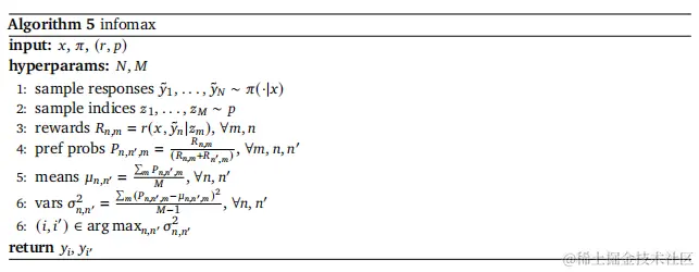 Infomax(算法5)以一个ENN奖励模型作为输入。与Boltzmann探索(算法4)一样,infomax从生成N个回答的语言模型开始。然后,从p中抽取M个认知指数。对于每一对回答和每个认知指数,ENN分配了一个概率给一个随机的人类评分者更喜欢第一个回答而不是第二个回答的事件。Infomax评估关于这个概率的不确定性是计算M个认知指数的样本方差。然后,该算法选择这对回答来最大化不确定性。直观地说,这可以被认为是对反馈信息量的最大化测量。 infomax的一个可能的限制是,该算法致力于寻找关于奖励的信息,无论这些信息是否对选择最佳回答有用。例如,infomax致力于细化奖励的估计,根据之前的反馈确定这是一个糟糕的选择。另一方面,双汤普森抽样更倾向于更多地关注有助于确定最佳回答的查询。正如论文看到的,双TS提高了infomax以及Boltzmann探索的性能。