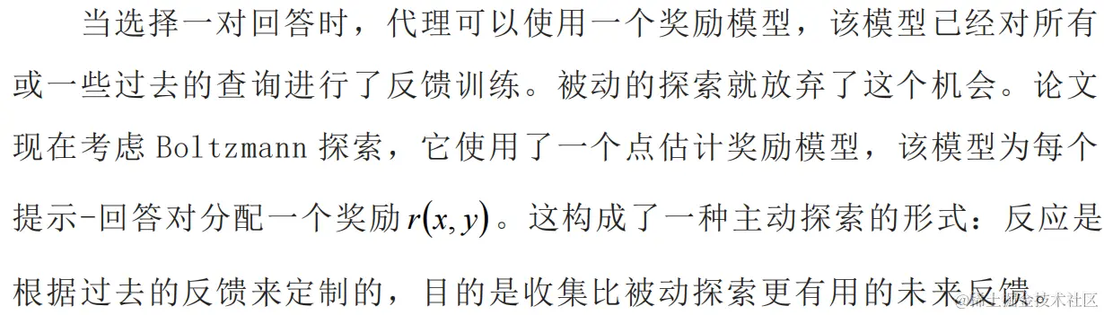 大型语言模型在从大量的文本数据中学习后显示出显著的能力,来自人类反馈的强化学习(RLHF)也极大地改善了他们的行为。聊天机器人的使用提供了收集越来越多的人类反馈的机会。人们很自然地想知道,这种不断增长的数据来源会出现什么新功能。超越人类的创造力仍然是一种诱人的可能性。 随着数量的增加,可以从人类的反馈中推断出更多。这就提供了进一步超越预先训练过的模型的信心。但是考虑到这个过程只能从人类学习,论文怎么能指望超越人类的聪明才智出现呢?也许这样的结果是合理的,因为评估比综合新的内容更容易。这类似于,对于一个NP-complete的问题,虽然解决方案很困难,但验证所提出的解决方案却很容易。 例如,假设一个预先训练过的模型从它的训练数据中推断出大量的——也许是数百万或数十亿——的想法,其中一个是巧妙的。虽然人类可能还没有提出这个想法,但从足够多的人类反馈中学习,可以从模型产生的大量想法中识别出它。而且,在这一创新的基础上,进一步的外推可以继续扩大创造力的前沿。这样,有了足够的人类反馈,一个模型就应该能够生成人类无法生成的内容。但是,收集所需的反馈是否需要数月、数年或几十年呢? 作者在这篇论文中提出了对积极探索有巨大好处的证据。通过积极的探索,论文指的是量身定制的互动,以引出有用的反馈。特别是,论文的研究结果表明,通过更少的反馈,可以获得高水平的性能。这种加速可能会使超越人类的聪明才智更快,甚至几十年。 从人类反馈(RLHF)中强化学习的一种常见做法是向人类评分者发送查询,每个查询由一个提示和一对不同的回答组成。每个评分者都表达对其中一种反应的偏好。提示从语料库中提取,而回答则由大型语言模型生成。随着这一过程的进展,奖励模型拟合于数据,并引导随后的反应与收到的反馈相一致。 在本文中,论文将注意力限制在上述类型的交互上,其中每个查询都包含一个提示的和一对不同的回答。论文将使用语言模型对每对回答进行抽样的标准实践称为被动探索。论文比较了被动探索与几种主动探索算法的性能。一个是Boltzmann探索,它倾向于选择具有更高预测奖励的反应。论文还尝试了两种利用认知神经网络(ENN)提供的不确定性估计方法。第一个,论文称之为infomax,它选择了一对回答,目的是最大化反馈所揭示的信息。这属于广泛使用的旨在最大化信息获取的算法集合。第二种方法被称为双汤普森抽样,根据它们是最优的概率对回答进行抽样。 图1比较了使用不同探索算法产生的经验结果。产生这些结果的实验在第5节中有所描述。每个绘制的点都对应于所达到的一个性能水平。水平坐标标识双TS为达到该性能级别所需的查询数量,而垂直坐标标识替代方案所需的查询数量。被动探索的图线清楚地表明,使用双TS的主动探索极大地减少了达到高性能水平所需的查询数量。在论文尝试过的算法中,论文只使用了一个点估计奖励模型,而不使用不确定性估计,Boltzmann探索表现最好。Boltzmann的图线表明,不确定性估计,如使用双TS,可取得显著的改进。最后,infomax的图线显示,即使在利用不确定性估计的尝试和测试算法中,探索算法的选择如何导致巨大的性能差异。