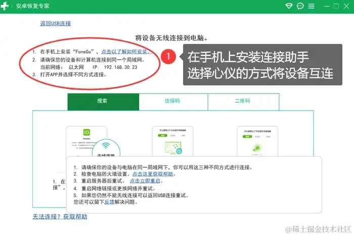 第二步:用户可以在界面中选择连接方式,例如无线连接,需要使手机和电脑处于同一网络环境下,具体可以选择搜索连接,或接收连接代码,也可以使用手机扫。