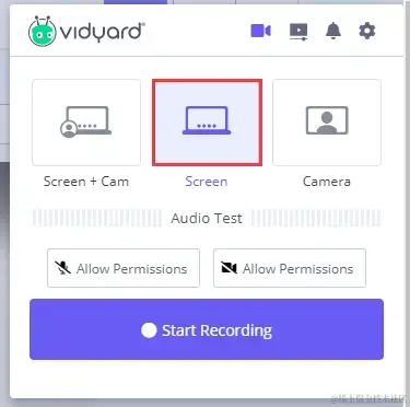 第2步:点击Vidyard插件图标,选择 “开始录制” 选项。在弹出的窗口中,您可以设置录屏参数(如是否录制声音、摄像头等)。