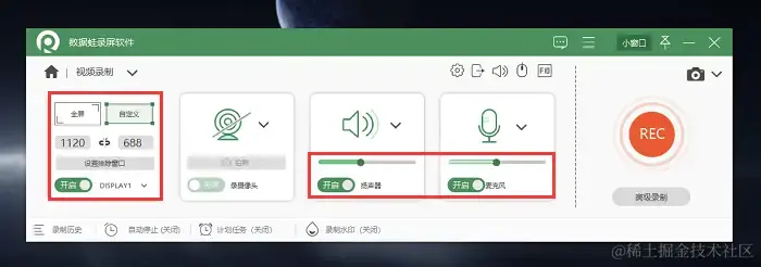 第2步:在 “视频录制” 模式下,你可以自定义录制区域的大小和位置,并调整录制的声音来源(麦克风与扬声器)。